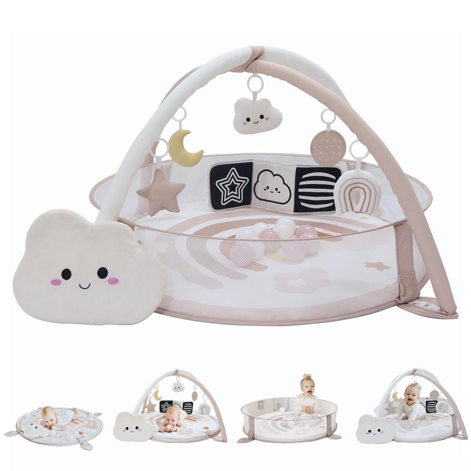 - 👼 {Adaptable} This versatile baby play mats for floor encompasses 6 different uses: tummy time mat, baby gym, pop up mesh fence, high contrast book, ball pit with 10 balls included and cloud storage bag. Engineered to align with your baby's developmental stages, this mat will capture your baby's attention providing hours of both entertainment and learning. Caution: Always ensure adult supervision during use.