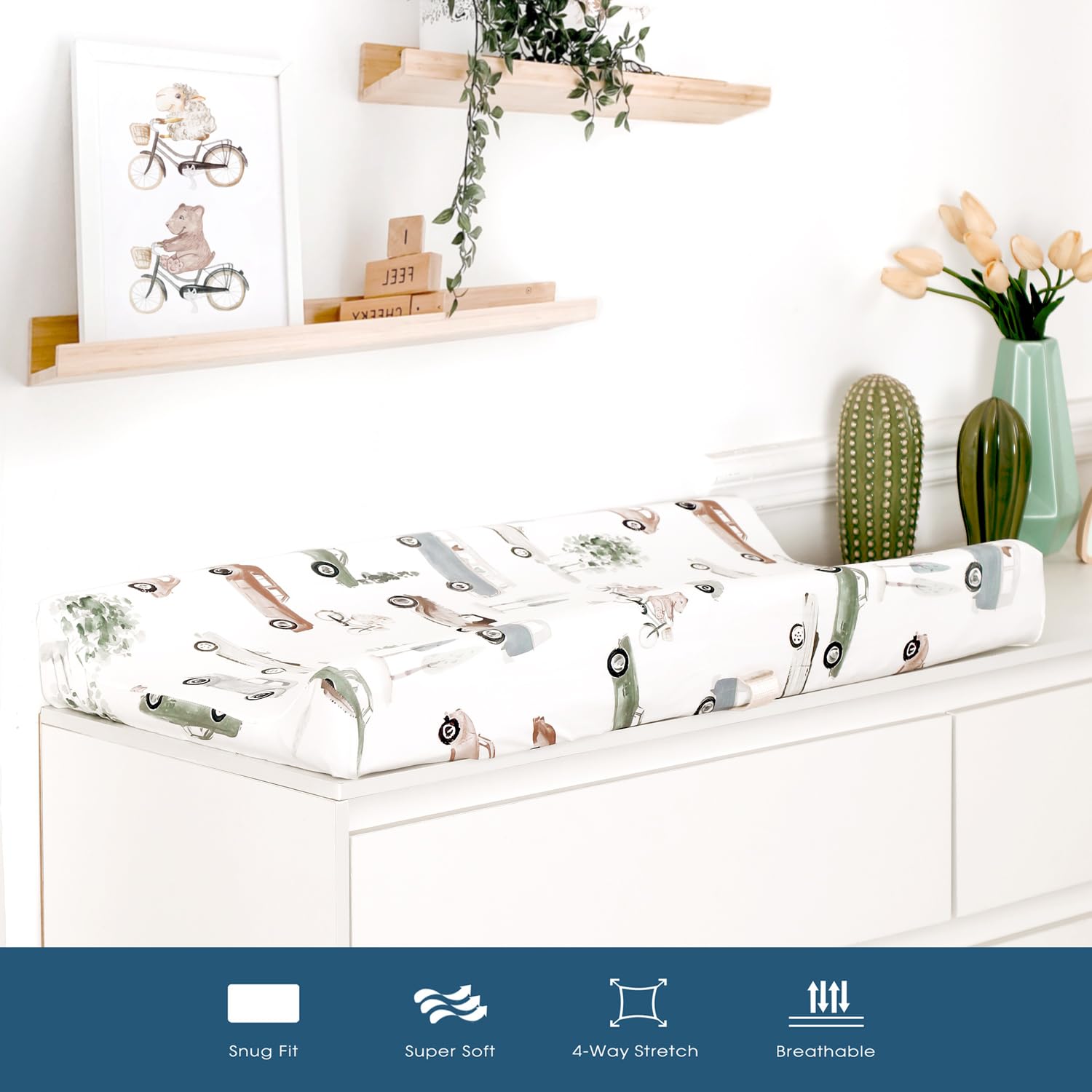 - Ultra Soft & 4-way Stretch: Made of 100% high quality soft stretchy jersey knit fabric. GRSSDER changing pad covers offer a breathable, sweat-absorbent tee shirt like feel for exceptional comfort, providing your little ones a safe and to stay in place throughout the day.