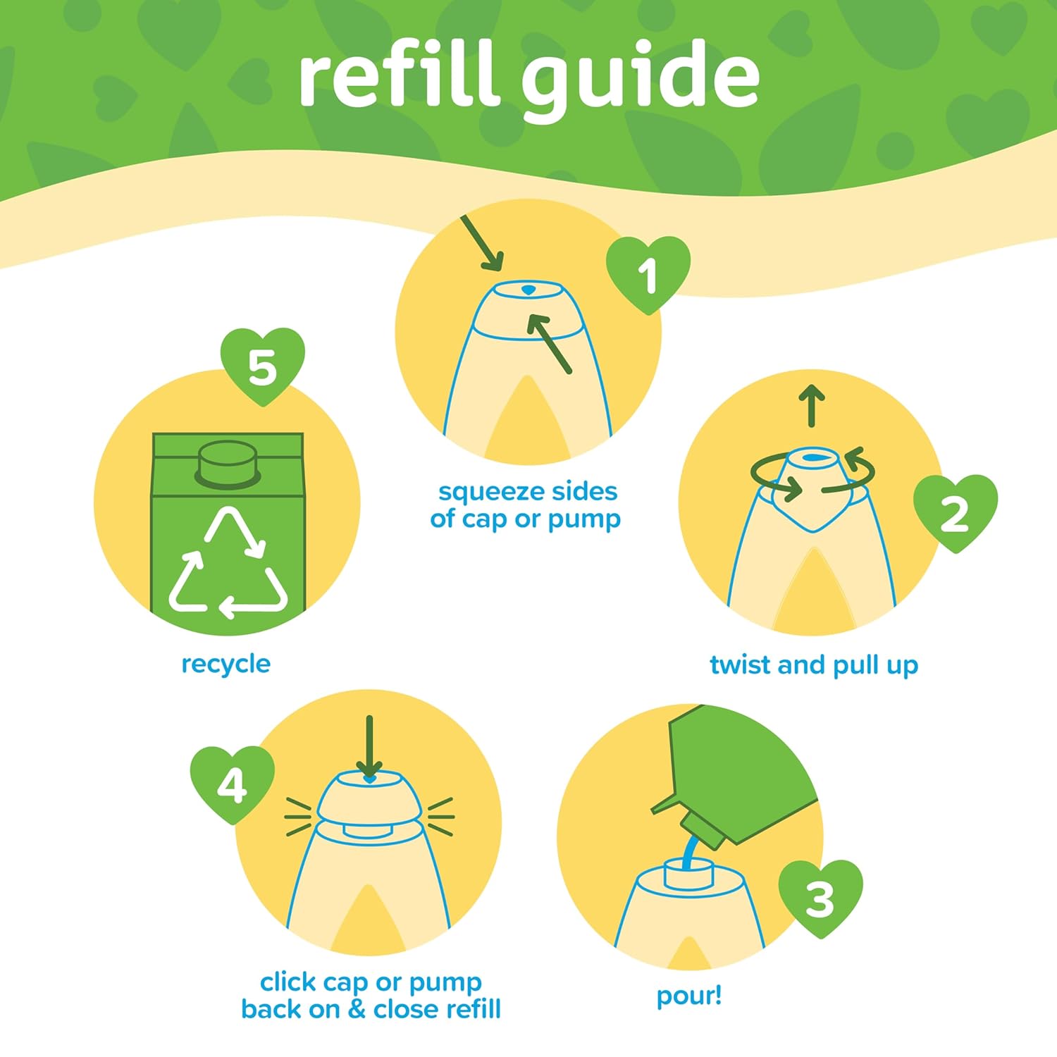 - To refill your Johnson's Head-to-Toe bottles, squeeze the sides of the cap or pump, twist & pull up to remove. Pour the baby wash & shampoo into the empty bottle & click cap or pump back on & close the refill. Recycle the refill carton when empty