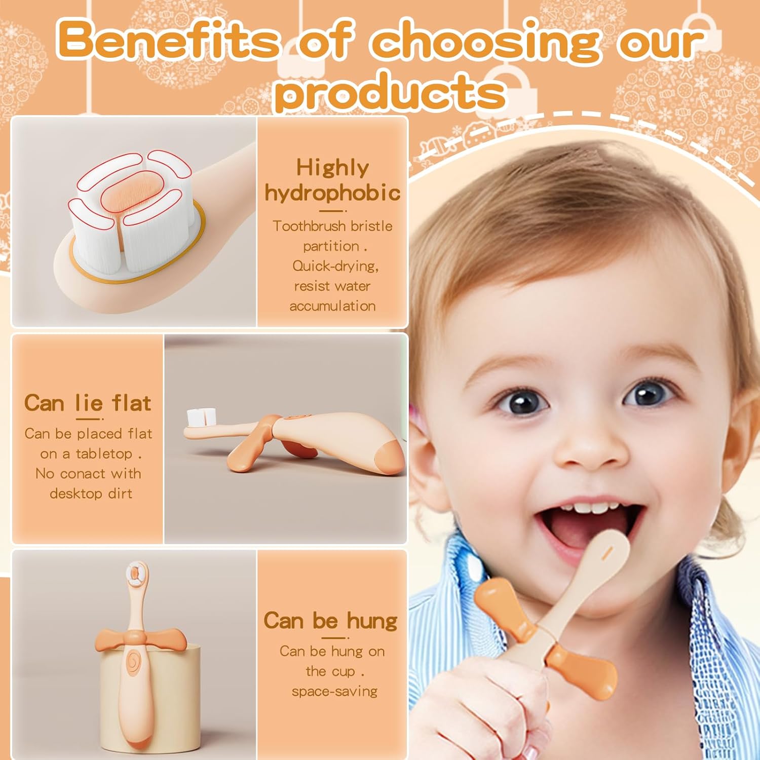 - ANTI-POKE THROAT DESIGN: Specially designed for baby's first toothbrush, the small stopper in the center prevents the toothbrush from poking the throat when baby is first learning to brush, which makes mom feel more at ease. It is also convenient for countertop storage and can be stored flat to prevent contact with the surface of the toothbrush head and make it easier to drain the toothbrush