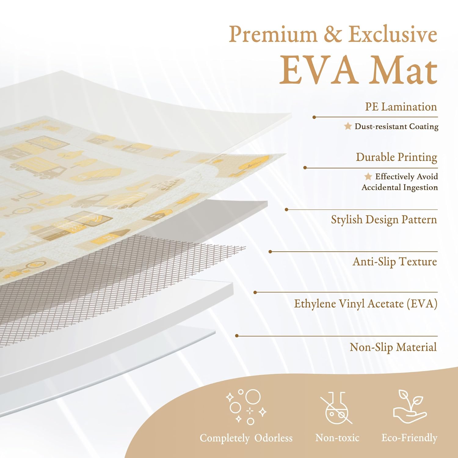 - 【SAFE MATERIALS】Made from durable, shock-absorbing, odorless, and non-toxic EVA foam, our mats ensure safety and comfort. Using a unique printing method, it effectively addresses issues like sun fading and peeling that other brands often encounter, prevents small pieces from breaking off and being accidentally swallowed by babies, and enhances overall durability. With zero-benzene technology, it eliminates toxic odors found in many commercial products, ensuring non-toxic and safe floor mats.