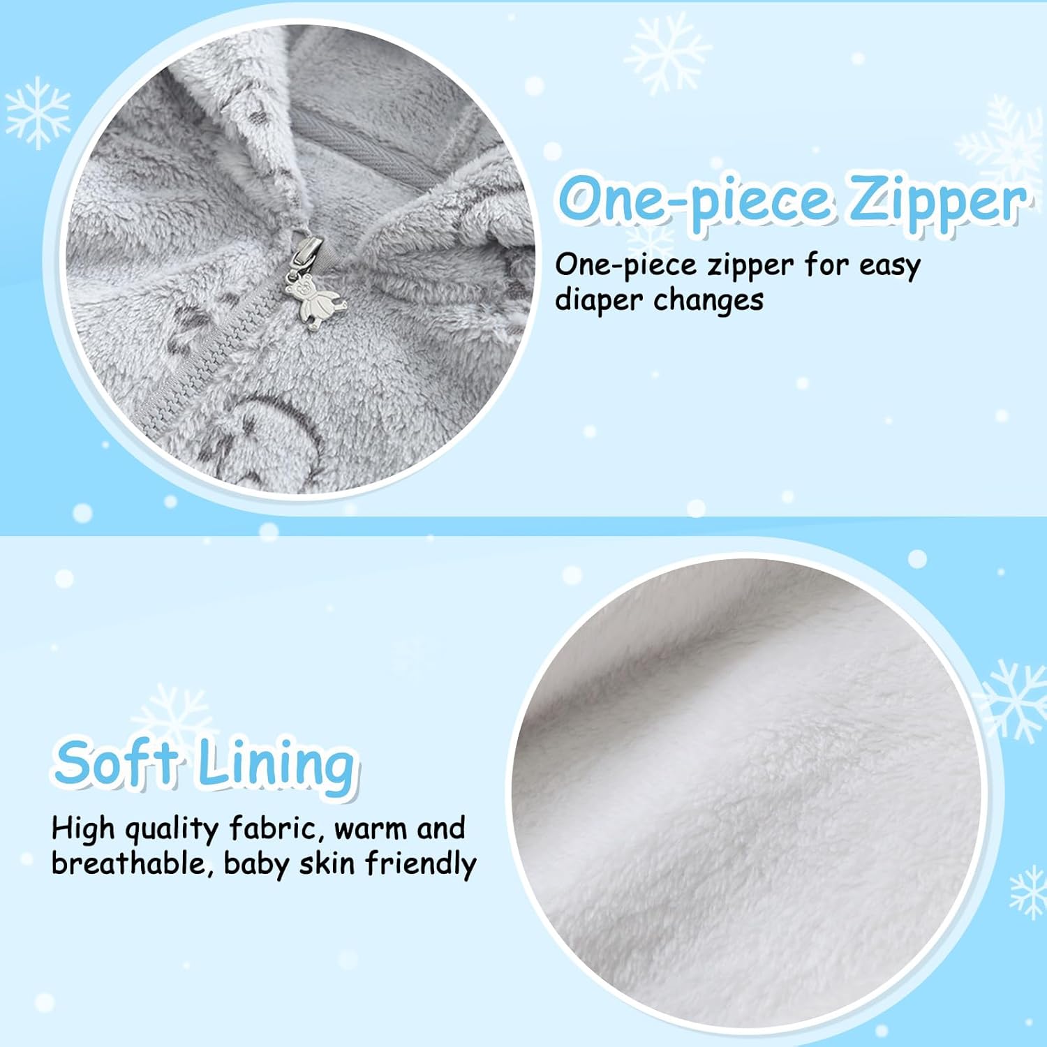 - 🐻【Attentive Design】 The winter baby fleece hooded romper with cute bear ears and cartoon pattern makes your baby look adorable, exquisite and beautiful. The one-piece suit with full-length zipper design makes it easy to change diapers.