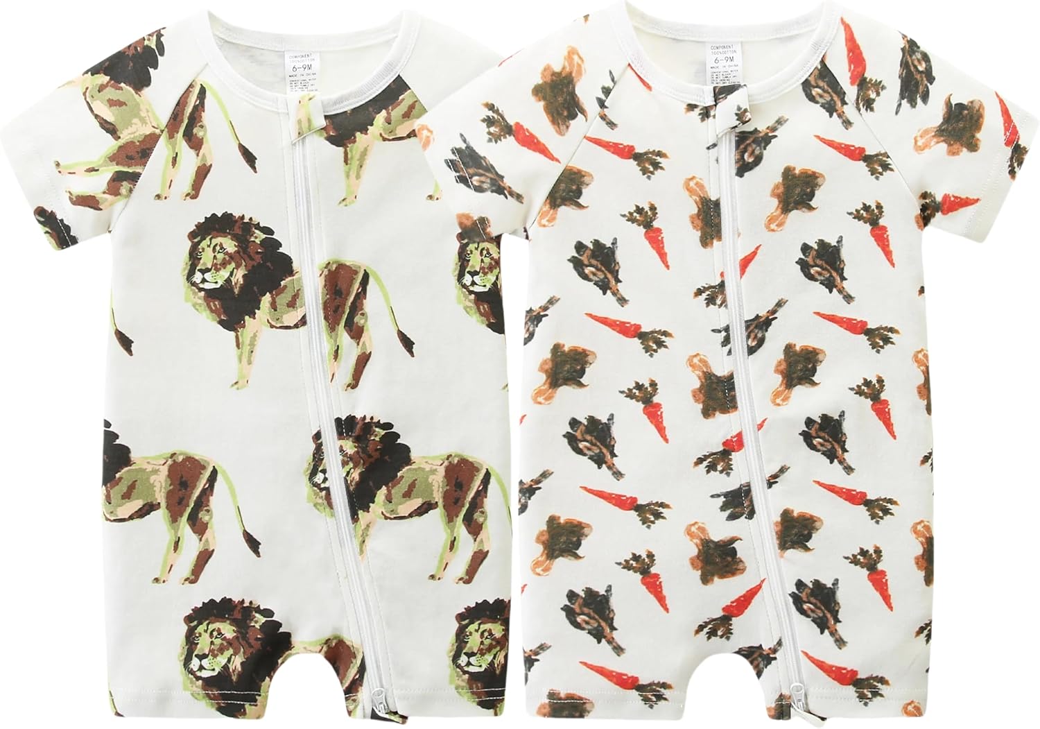 Unisex Summer Trendy 2-Pack Rompers Short Sleeve Zipped Bodysuit Infant Cotton Outfits