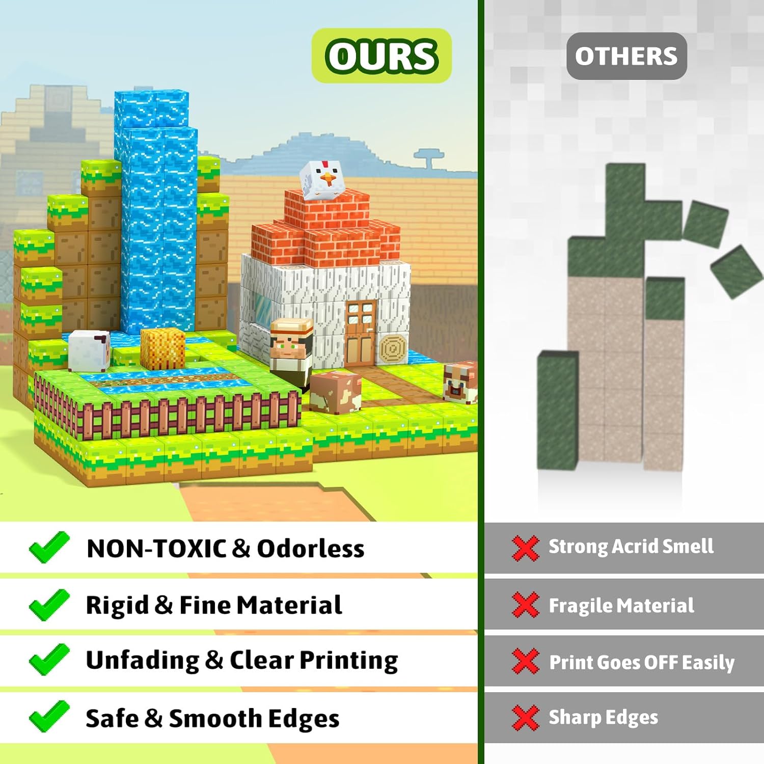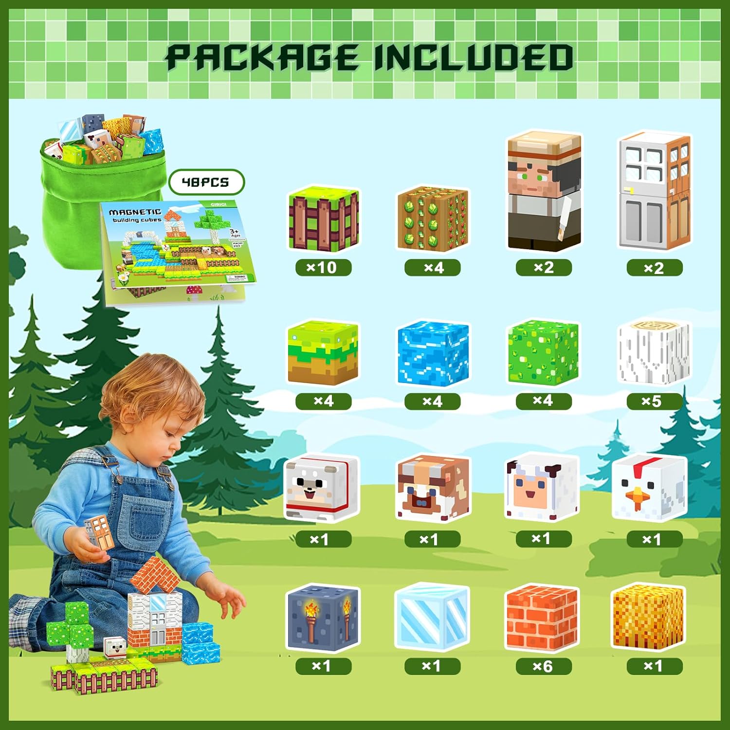 - β Magnetic Blocks Farm Life Set: Step into a delightful world of rural life with our magnetic building blocks set! Featuring a little farmer, along with cute animals,vibrant crops,torches..Kids can create their own bustling farm with magnetic blocks.Unleash your children's creative thinking as they explore farm life and enjoy hours of imaginative role-play fun!