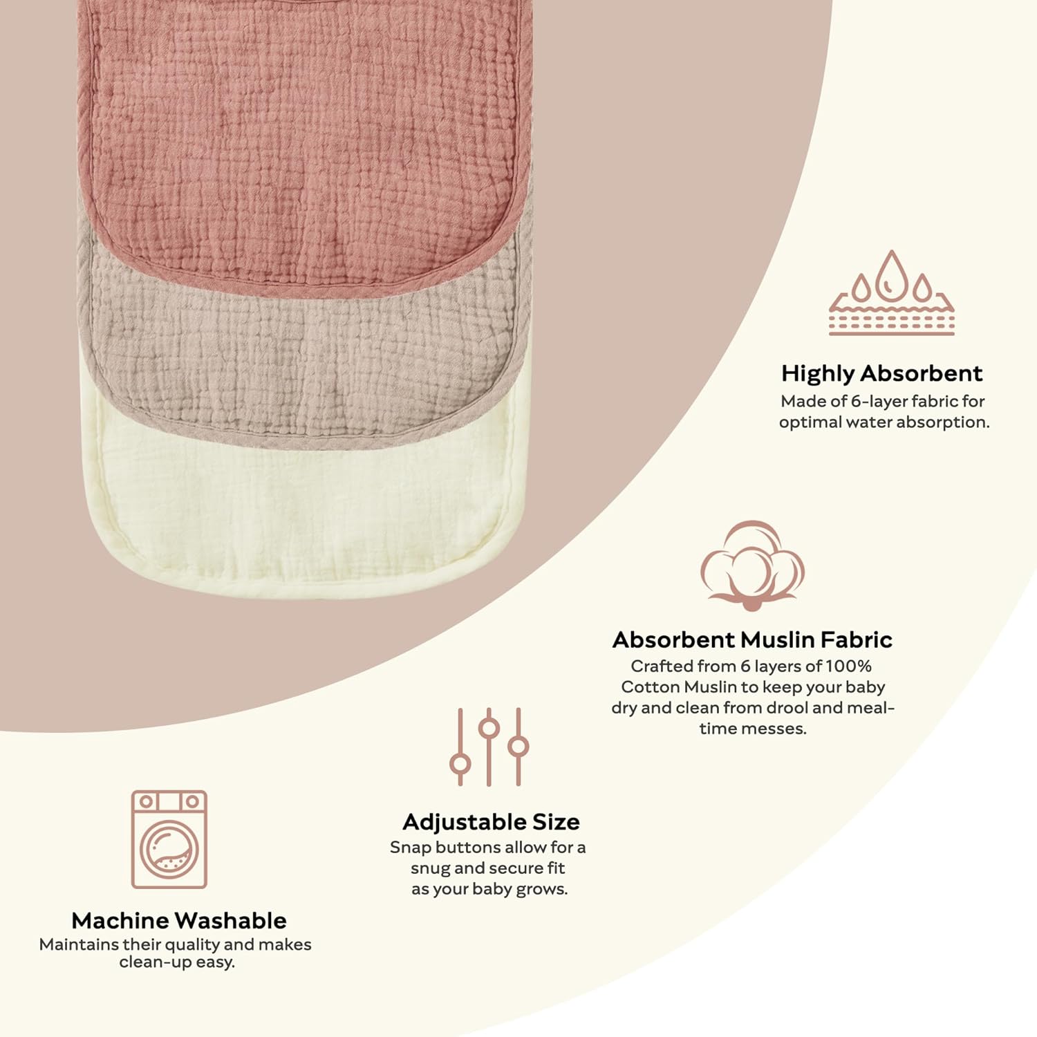 - Adjustable Snaps: These bibs feature easy-to-use snaps, making it a breeze to get them on and off your little one quickly and easily