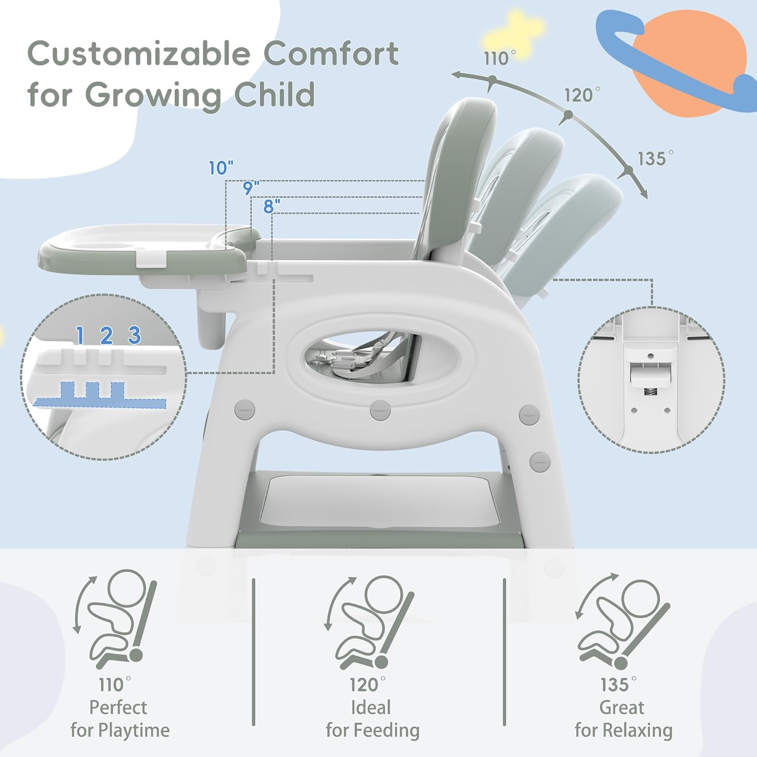 - 🍼 ADJUSTABLE SEAT BACK & TRAY POSITIONS - Featuring a 3-position reclining backrest(110°, 120°, 135°), this baby food chair offers customized comfort for different activities. The tray adjusts to three positions, providing ample space as your child grows. The soft, skin-friendly PU seat cushion is removable and easy to clean.