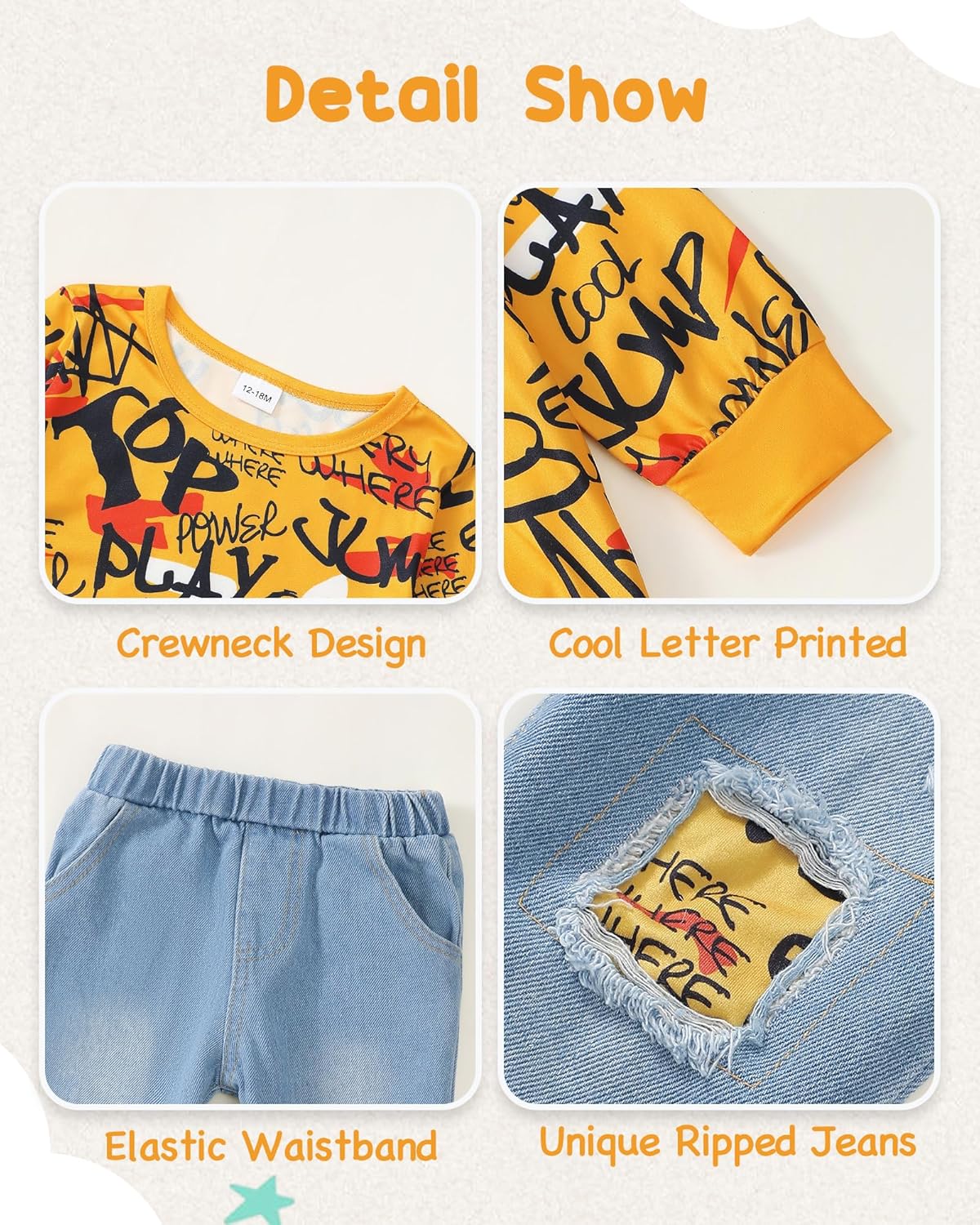 - Package Included: 1pc toddler baby boys sweatshirts pullover tops + 1pc ripped jeans pants. Fall winter baby boys' clothing sets are great gifts for infant boy and toddler boys.
