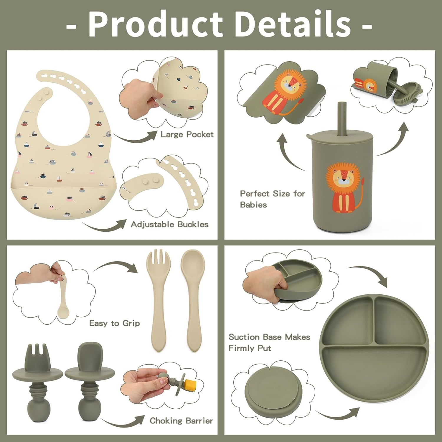 - Baby Feeding Set: Get your baby to love mealtime and free up mom's hands! This 8-piece baby feeding set includes 1 suction-divided plate, 1 straw cup, 2 baby bib with a catch pocket, 1 first-stage toddler fork, 1 first-stage toddler spoon,2 long-handled forks and spoons