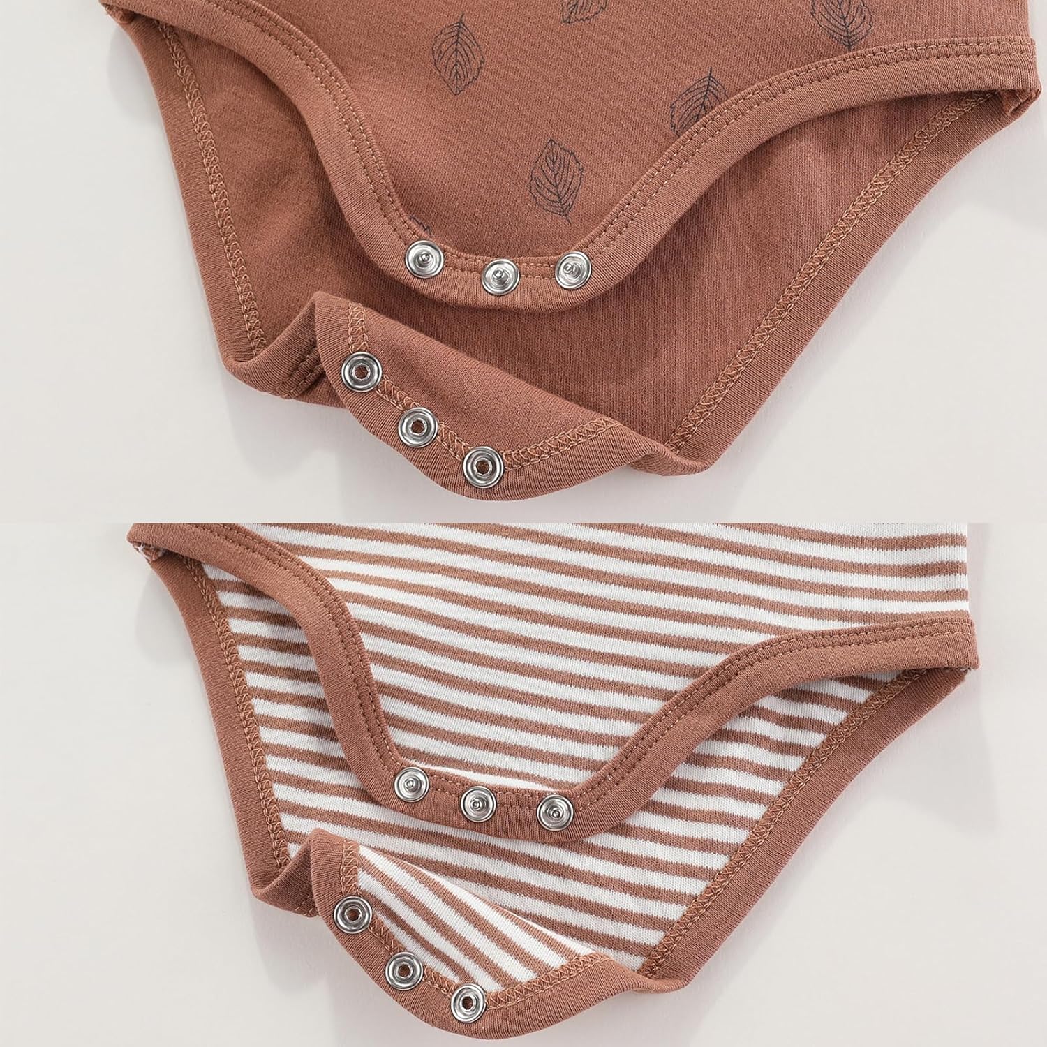 • Bodysuit and Pants Set Design 1: Bodysuit has three metal snap buttons at the bottom for easy changing. The pants have elastic and shrinkable cuffs for easy play