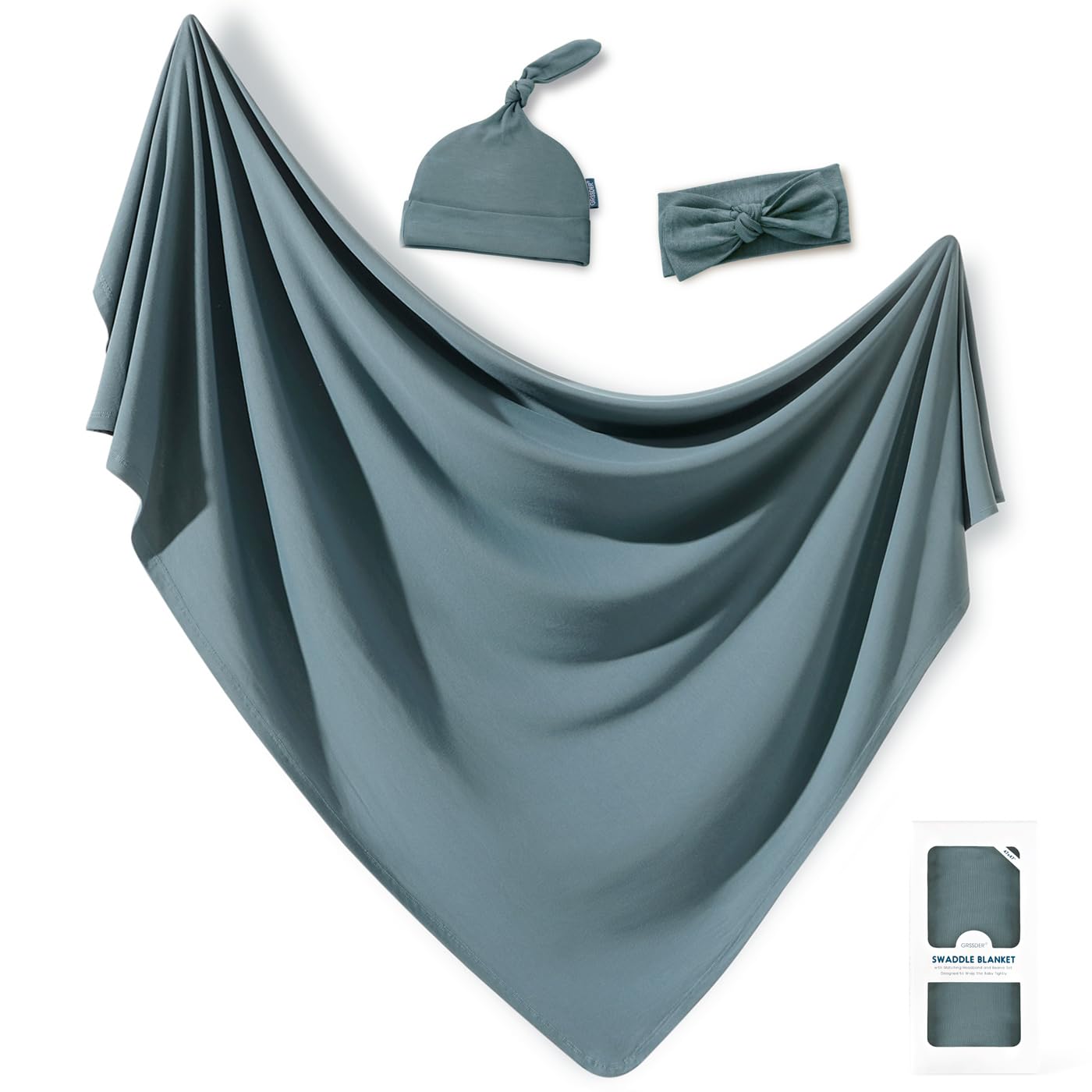 GRSSDER Newborn Swaddle Blanket, Ultra Soft Jersey Receiving Blanket with Matching Headband and Beanie Set, 47×47" Extra Large Nursery Swaddle Wrap for Girls and Boys