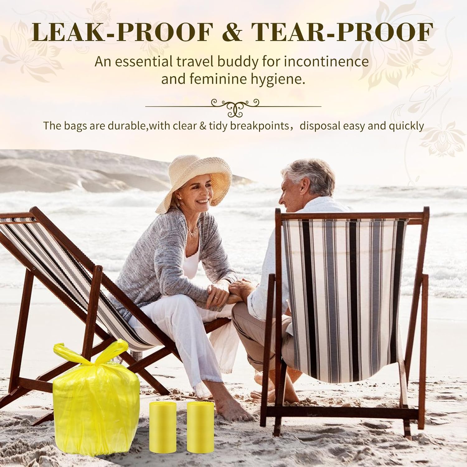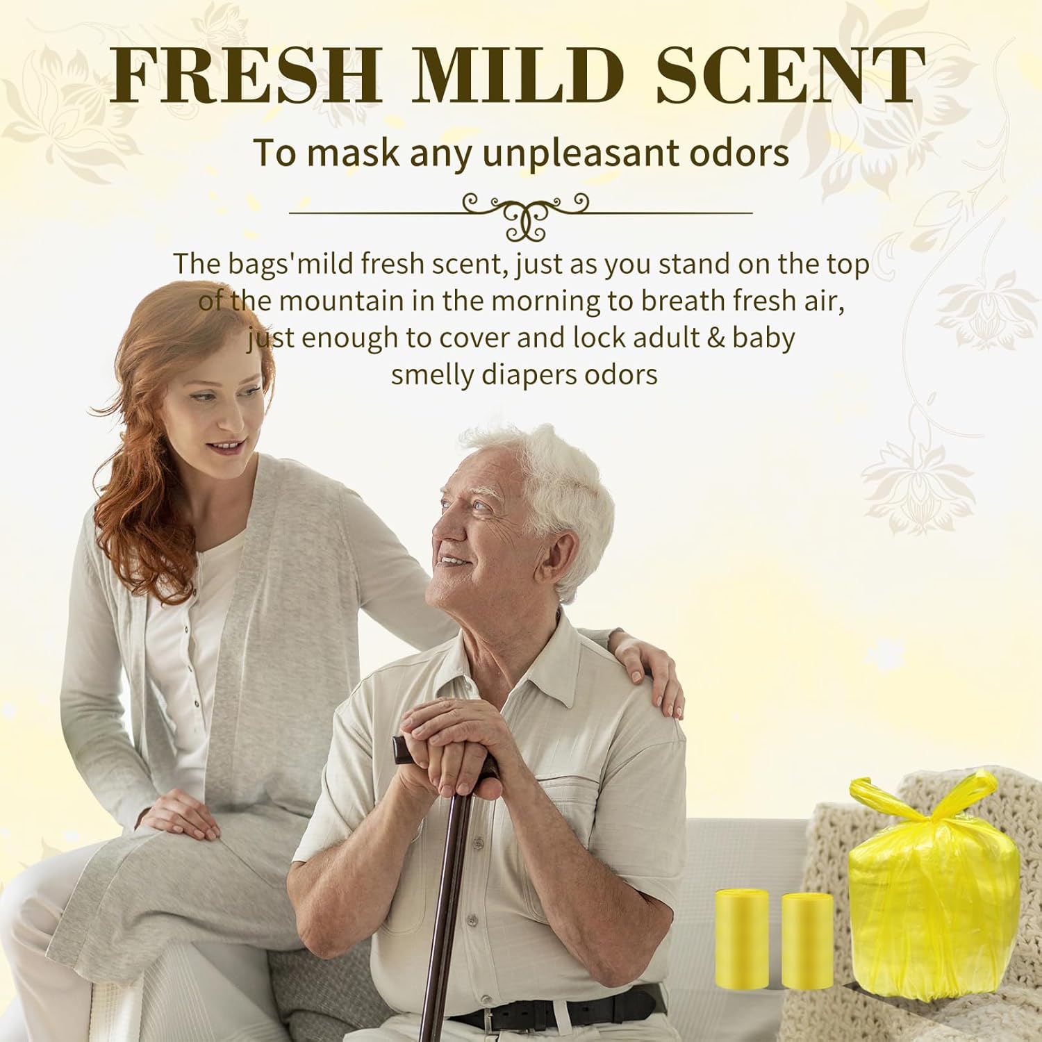 - 【Durable & Easy to Get 】These yellow Diaper Sacks are leak proof , with Easy-To-Tie-Tabs and recycled plastic,healthy for Adults & Baby. The diaper trash bags scented garbage bag allows be quickly and easily torn from the rolls, quickly disposable feminine and incontinence products scented garbage bag,because of clear & tidy breakpoints.
