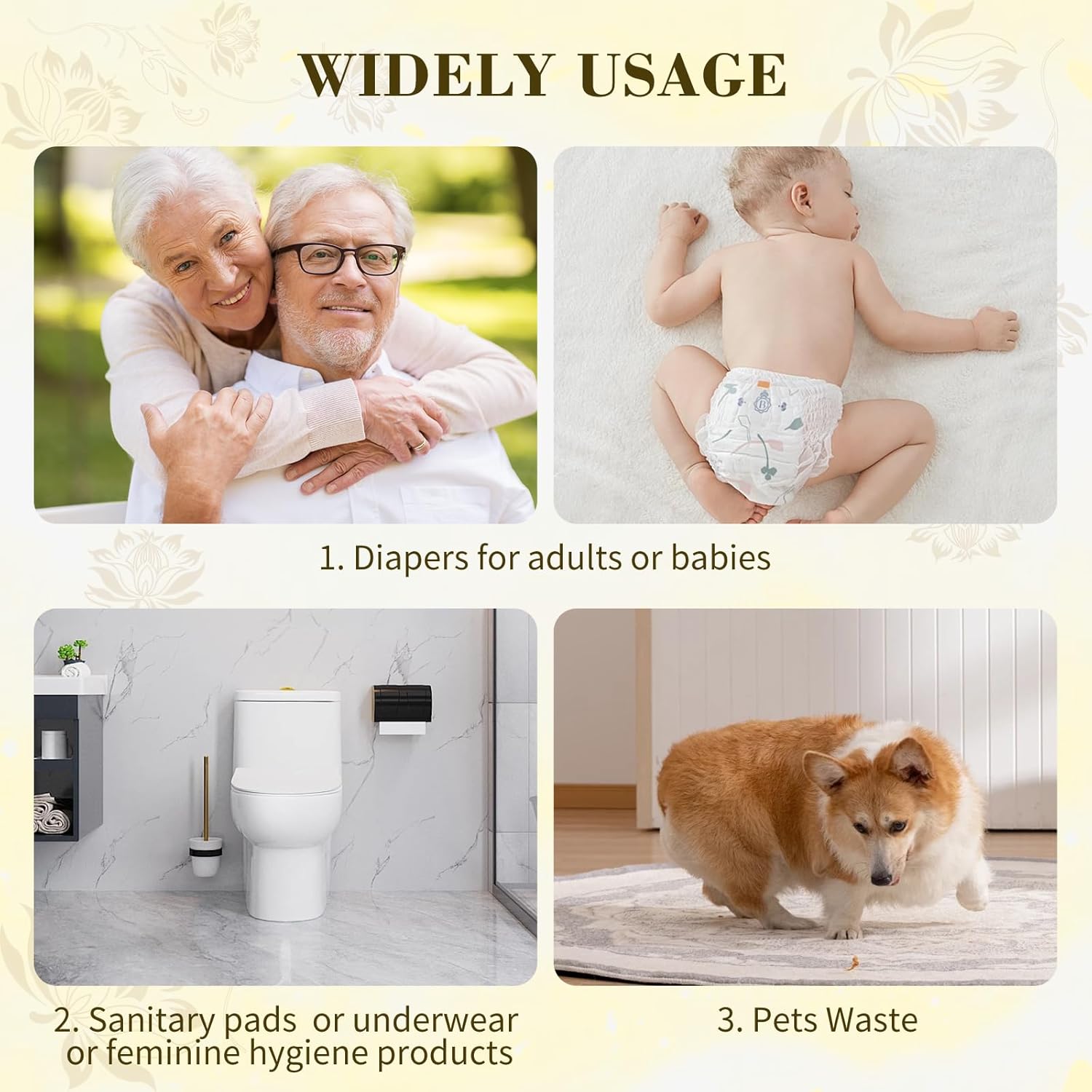 - 【Multi Purpose】 The odor-proof plastic garbage bag refills fit for the disposal of adult Incontinence Odor/sanitary pads/napkins and underwear, adult diapers, feminine/hygiene and incontinence products,overnight pads. Carrying this discreetly in your (diaper) bag is easy. The bags are thick and durable to give you confidence and peace of mind. Also great for big dog poop, large stinky diapers, cat litter etc.