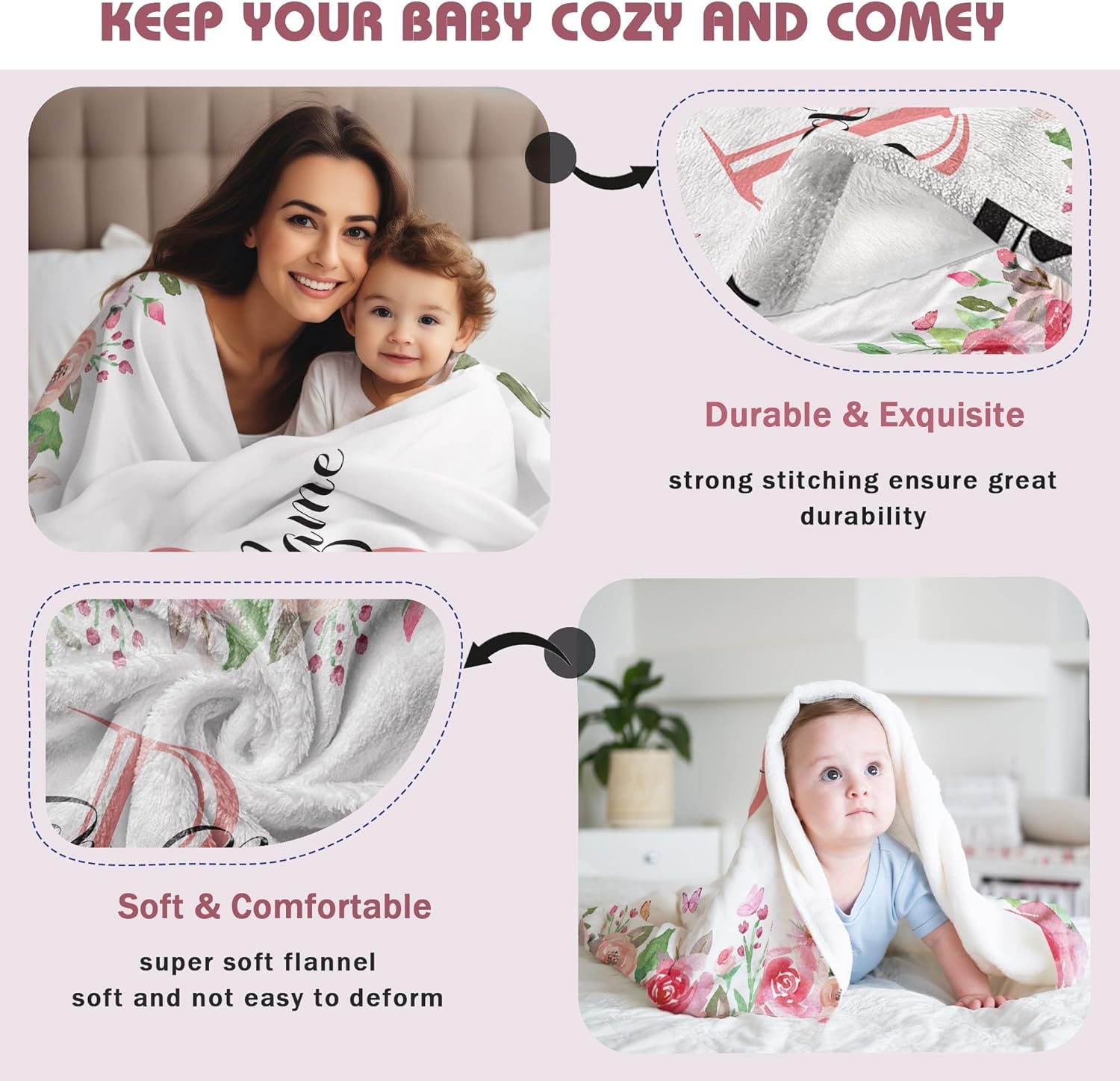 - Custom baby blanket with name: Our custom name blanket is made of flannel, safe for the baby's delicate skin.