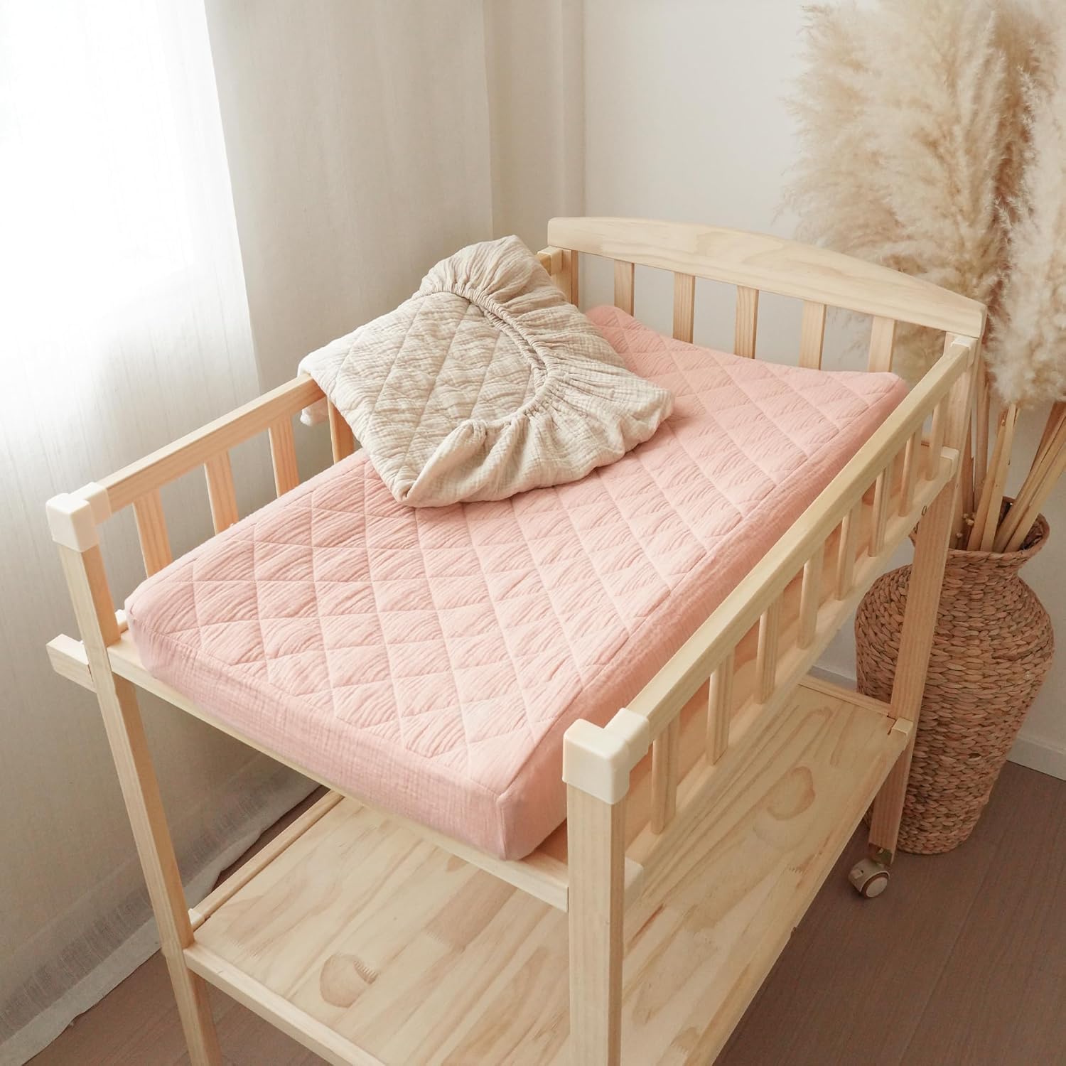 Konssy Waterproof Muslin Changing Pad Cover 2 Pack, Quilted Cotton Fitted Diaper Chang Table Cover, Soft Changing Pad Sheets for Girls Boys (Pink, Cream)
