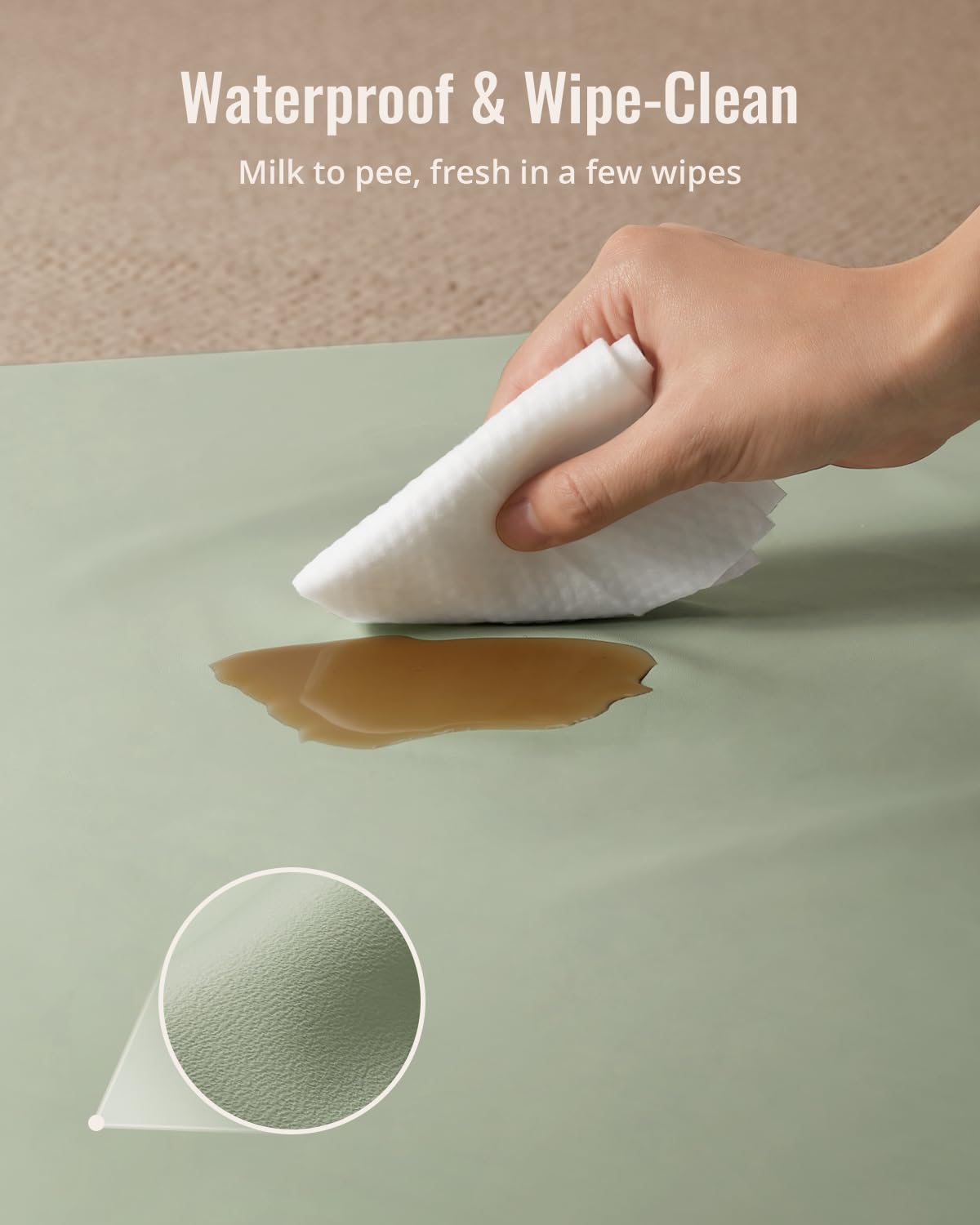 - Waterproof & Easy to Clean-Unlike many other mats that absorb spills, this vegan leather baby play mat is 100% waterproof, making it effortless to clean. Just wipe it down with a damp cloth to remove food, milk spills, or any other mess, keeping your baby’s play area spotless and hygienic