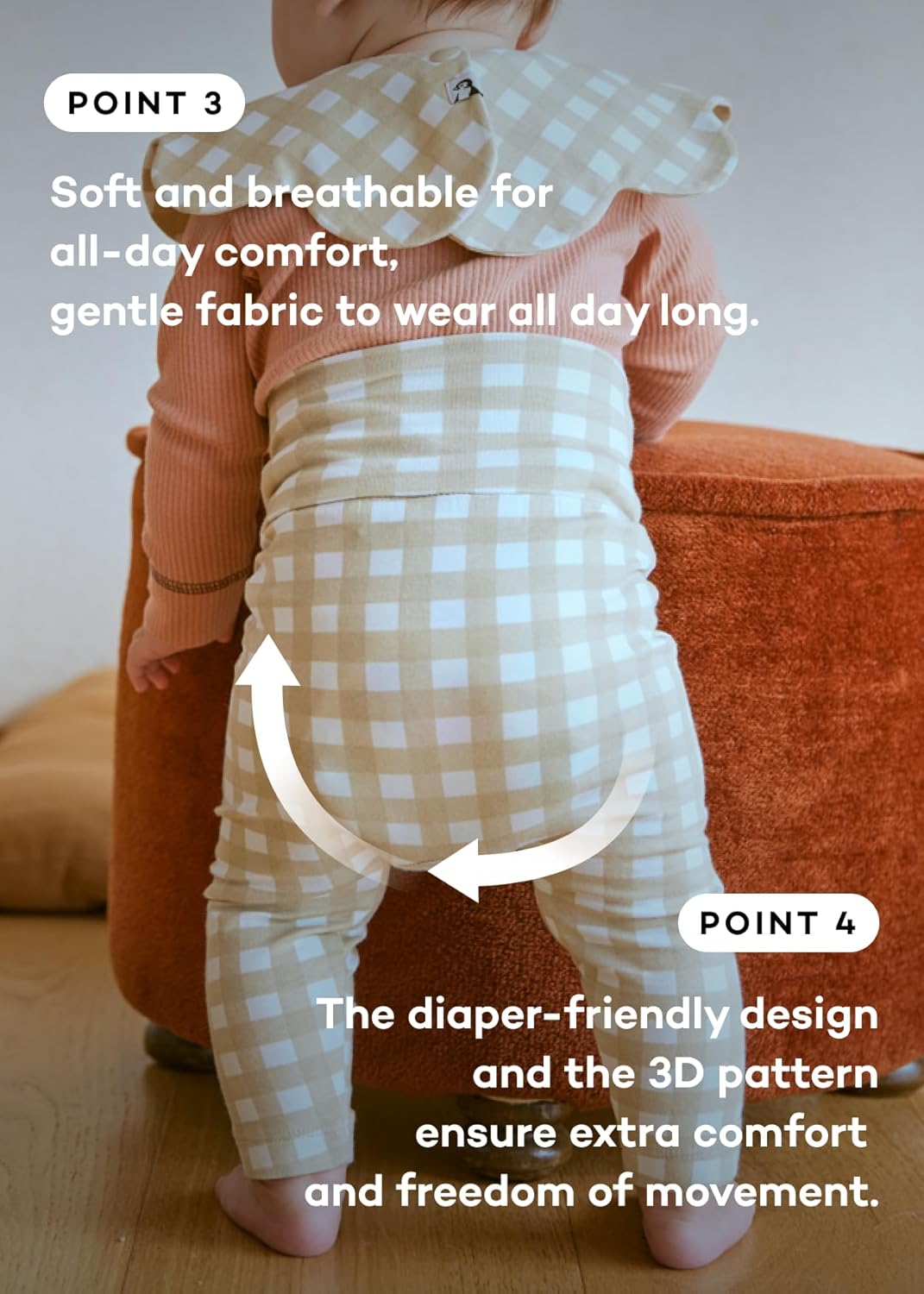 • Comfortable Elasticity: A 3D pattern designed for an ample rise for your baby’s hips.The long rise fully covers your baby’s diaper, ensuring a snug fit without any tightness or discomfort, and allowing for easy movement.