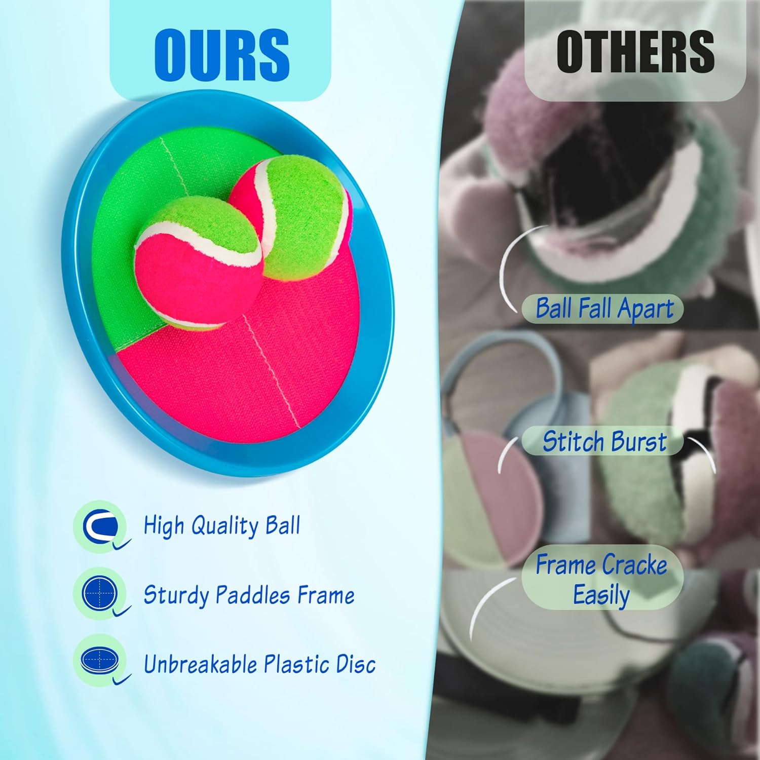 - 【High-Quality Waterproof Materials】 Our toss and catch ball set features upgraded ABS and nylon materials, ensuring exceptional durability and water resistance. The high-quality construction includes tightly stitched paddles and balls that withstand frequent play, while the reinforced bottom of the paddles minimizes impact and damage, making it ideal for outdoor fun in any condition.