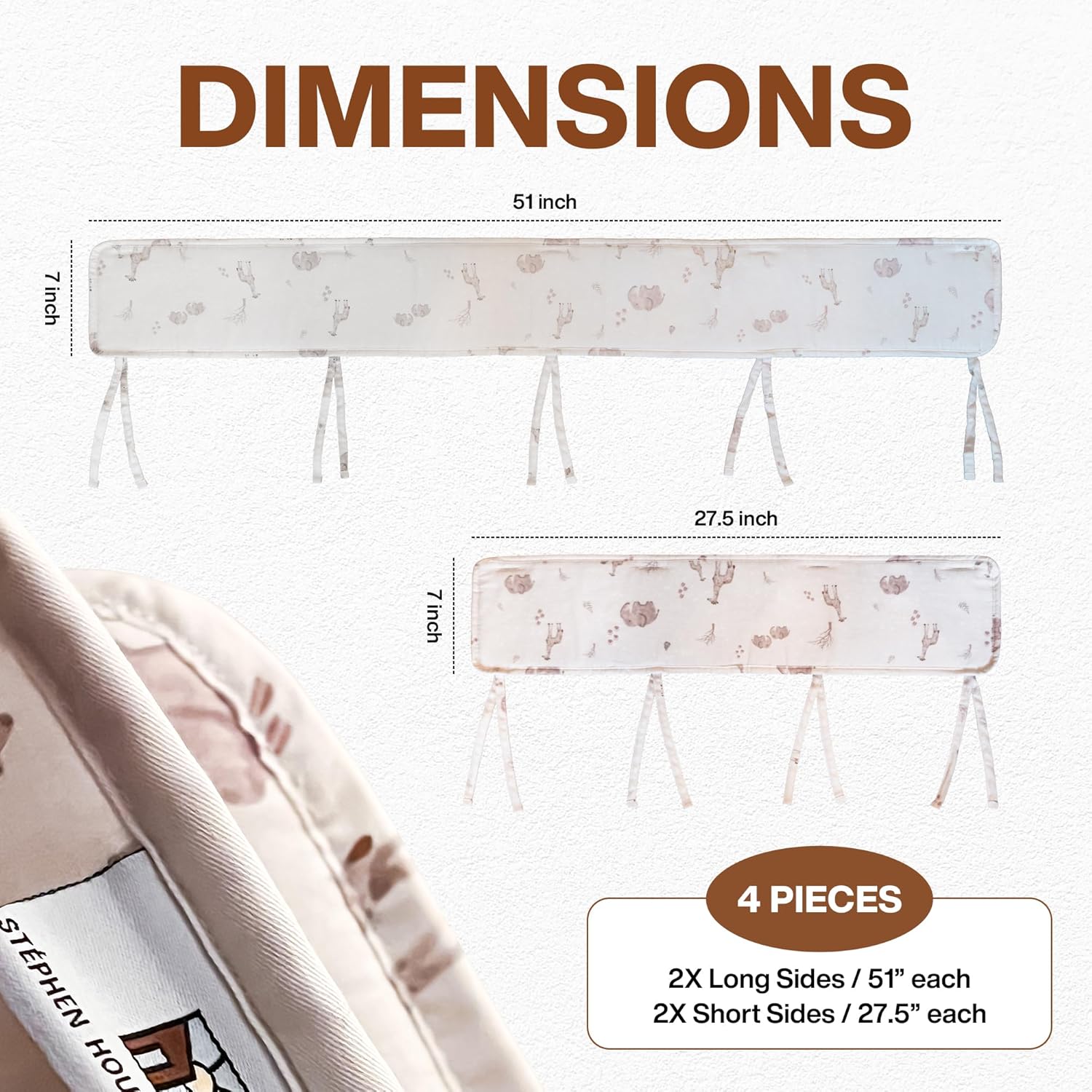 - DESIGNED TO FIT BEAUTIFULLY: The guard rail top cover consists of 2 long panels (51" x 7") and 2 short panels (27.5" x 7") and works perfectly on top of a 52“ x 28” full-size bed. Designed to fit snugly on standard-sized beds for a perfect wrap on all 4 sides. Durable fabric ties secure a perfect fit. The design’s soft, earthy tones will complement a large variety of gender neutral nursery decors from modern safari nursery decor to modern nursery decor, from woodland nursery for girls/woodland nursery for boys to boho nursery for girl/boho nursery for boy. Note: Not ideal for high-back, solid-sided, or fixed-sided baby beds.