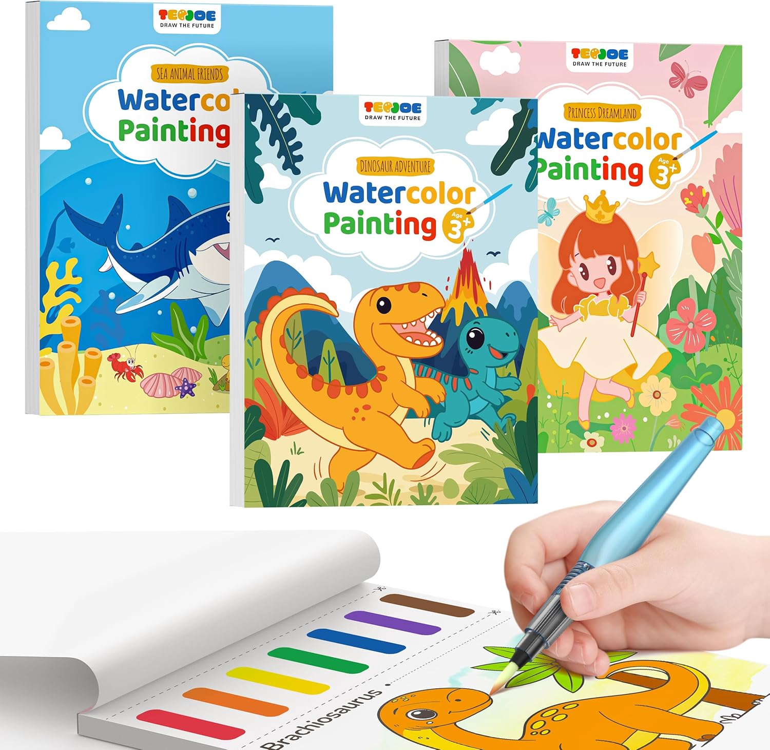 TECJOE 3 Pack Paint With Water Coloring Books for Toddlers, Watercolor Paint Set with 6 Brushes, Painting Activity for Kids Ages 4 5 6 7 8, Christmas Gift arts & Crafts Toy, Princess, Dinosaur & Sea