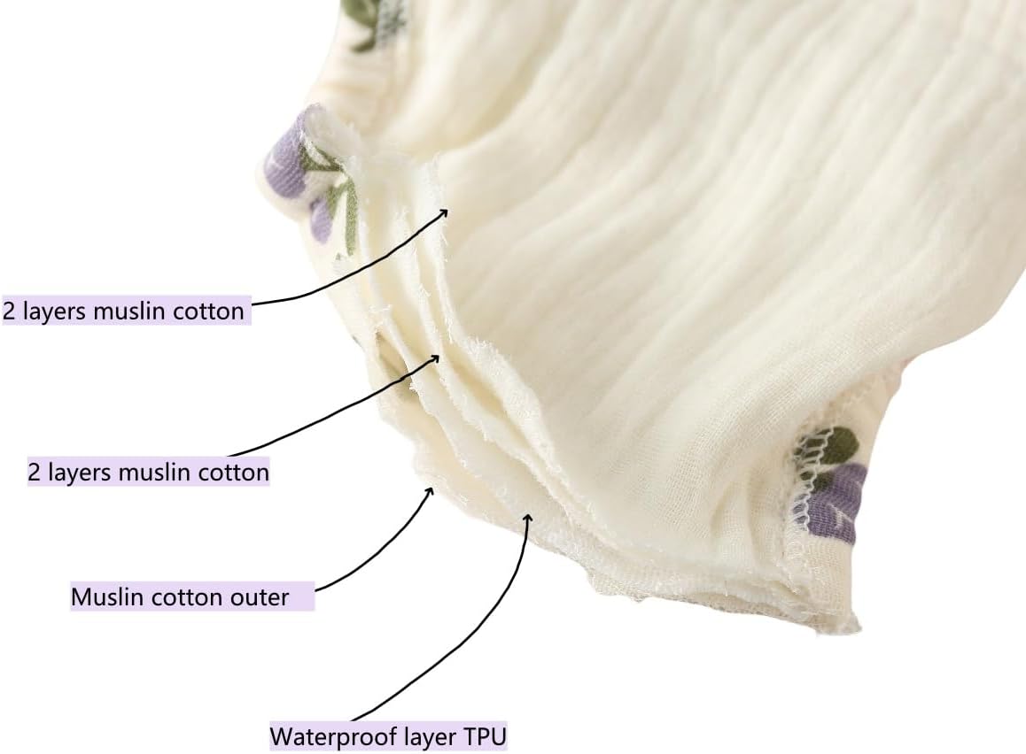 - MATERIAL:Our baby training underwear made of premium cotton muslin and waterproof layer of TPU.Soft and breathable and kind to sensitive skin that could prevent diaper rash.