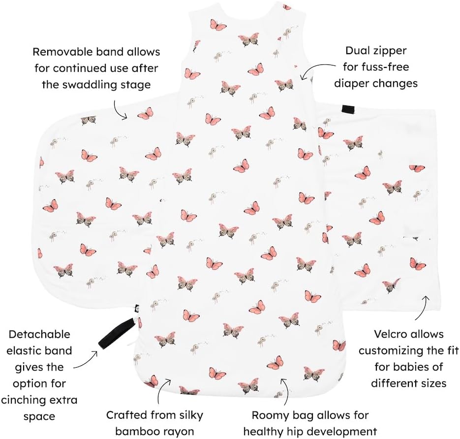 - Fully removable swaddle wrap attached to the sleep bag via Velcro, which allows for different positioning of the swaddle as baby grows.