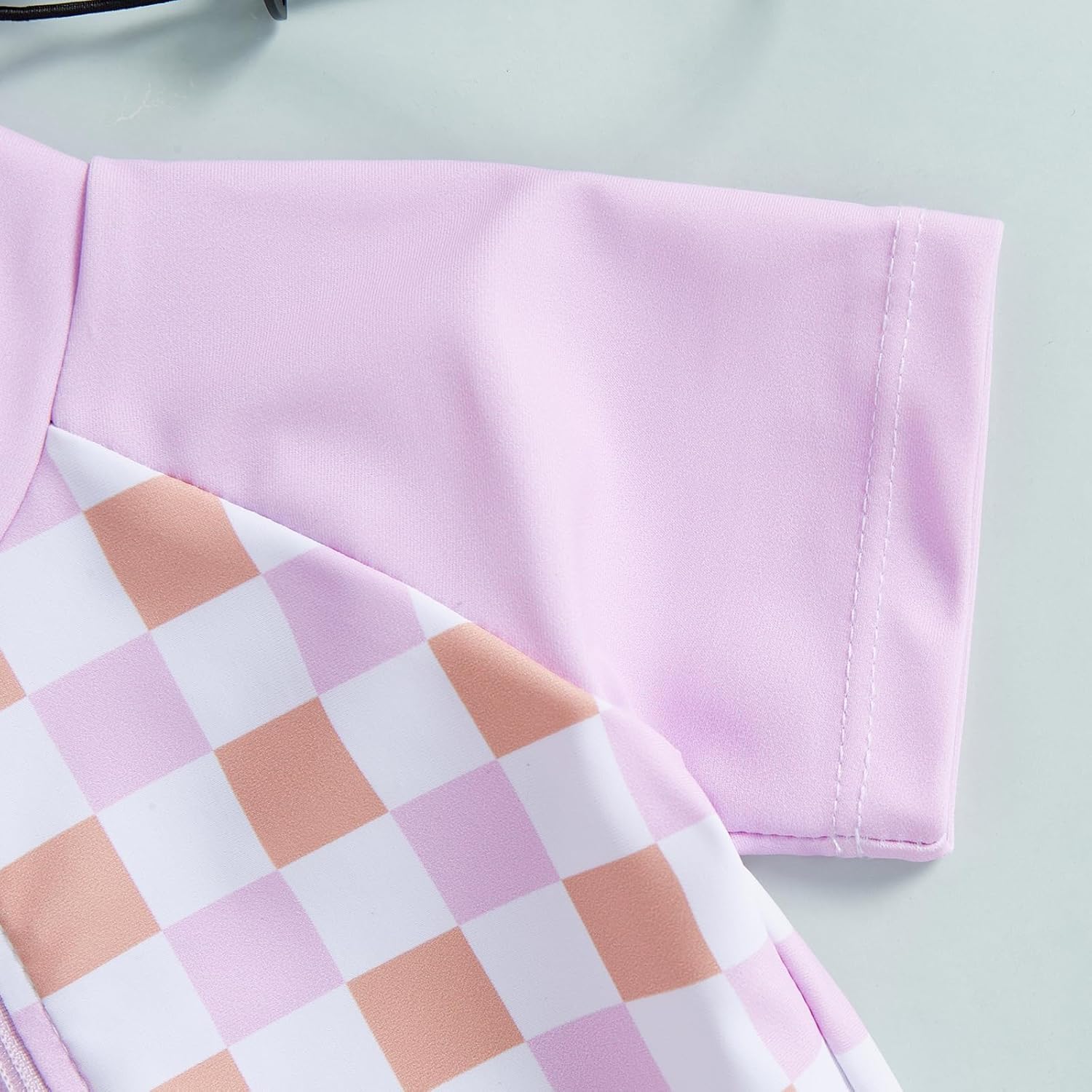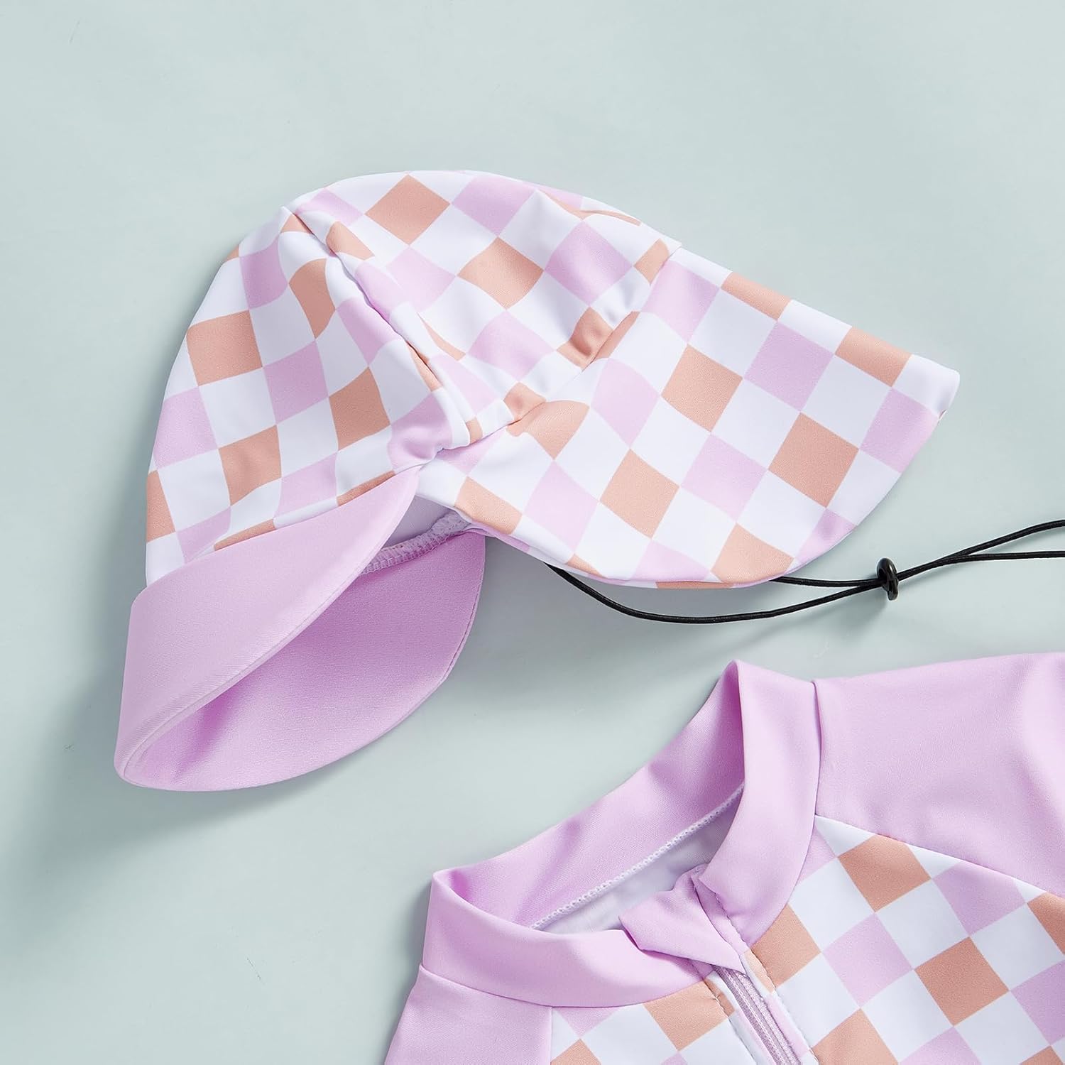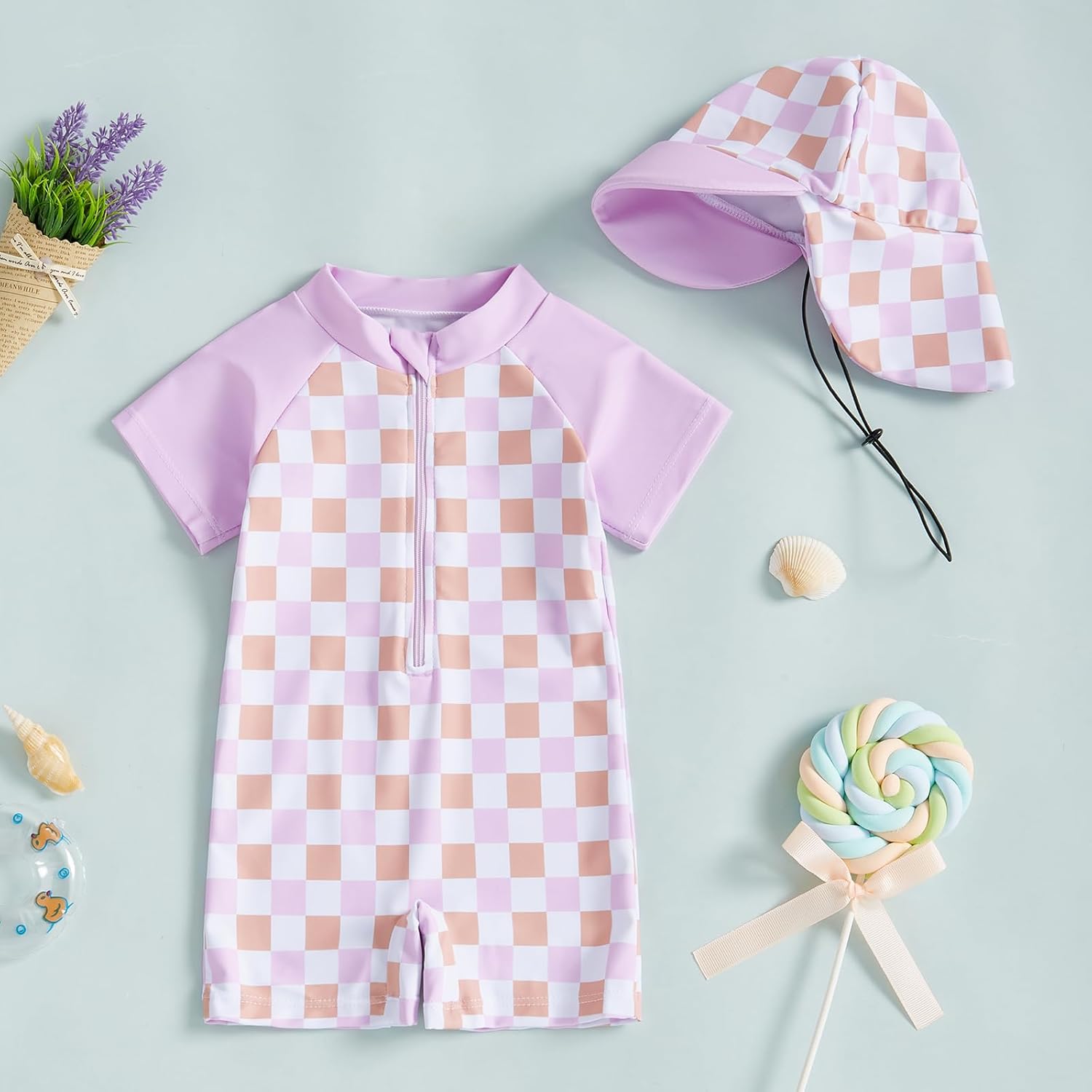 • KIDS BEACHWEAR: Baby boy rash guard swimsuit; Baby girls rash guard swimsuit,baby boy bathing suit classic plaid print, adding a fashionable touch; Short sleeves and round neck, front zipper closure, easy to put on and take off; And hat set, perfect for summer wearing
