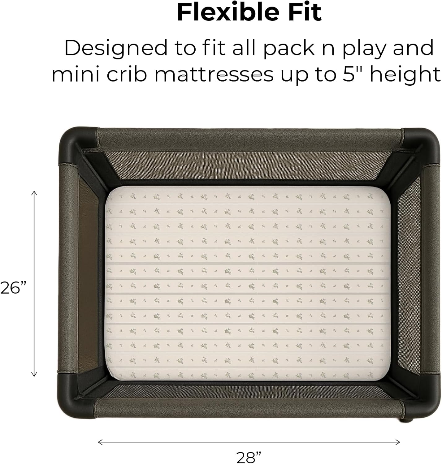 - Flexible Fit for Standard Pack n Play and Mini Crib Mattresses: Our sheets, sized at 38”x24”x5”, feature an innovative elastic band for adaptable stretch and a secure fit. Designed for standard Pack and Play mats (39”x27”x0.5”), portable, and mini crib mattresses (38”x24”x3”), the elastic ensures the sheet stays snugly in place on mattresses up to 5 inches thick. Compatible with Graco Pack n Play and other standard playards and playpens, it provides a smooth, safe surface for your baby.