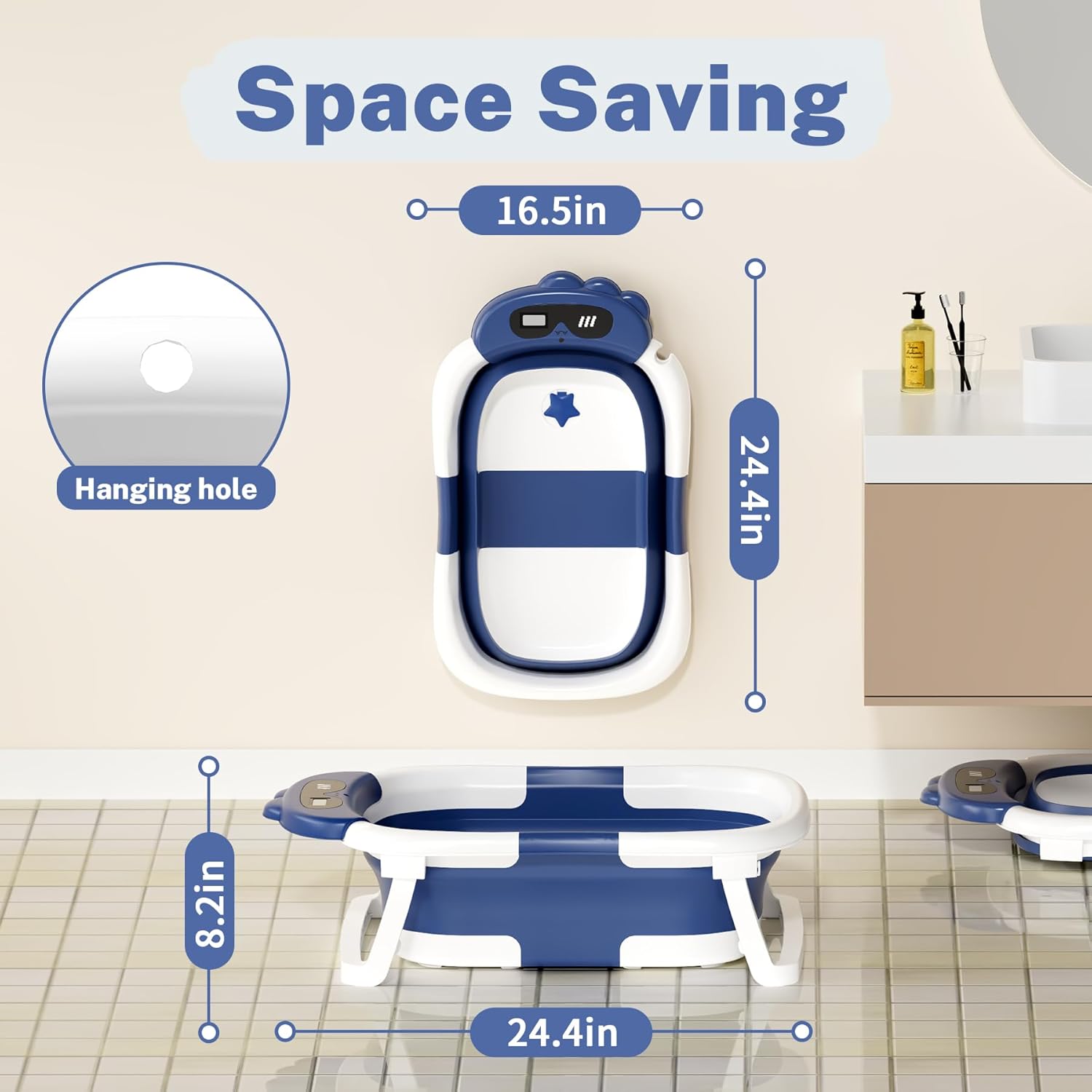 AVIDOR Baby Bathtub,Collapsible Bathtub for Newborn to Toddler,Durable Essential Infant Bath Tub,Portable Travel Baby Tub with Soft Bath Net,No-Slip Feet and Dinosaur Shaped (Navy Blue)