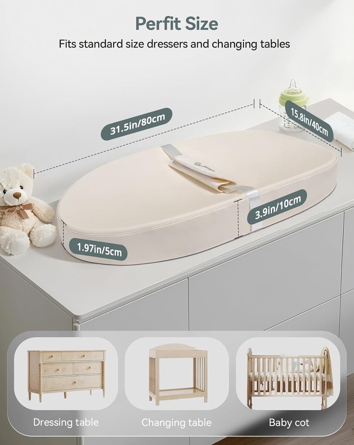 COMOMY Baby Changing Pad with Wipeable & Waterproof PU Cover, Contoured Diaper Changing Pad for Dresser with Non-Slip Safety Belt, Portable and Lightweight, Large Cushioned Foam, Beige