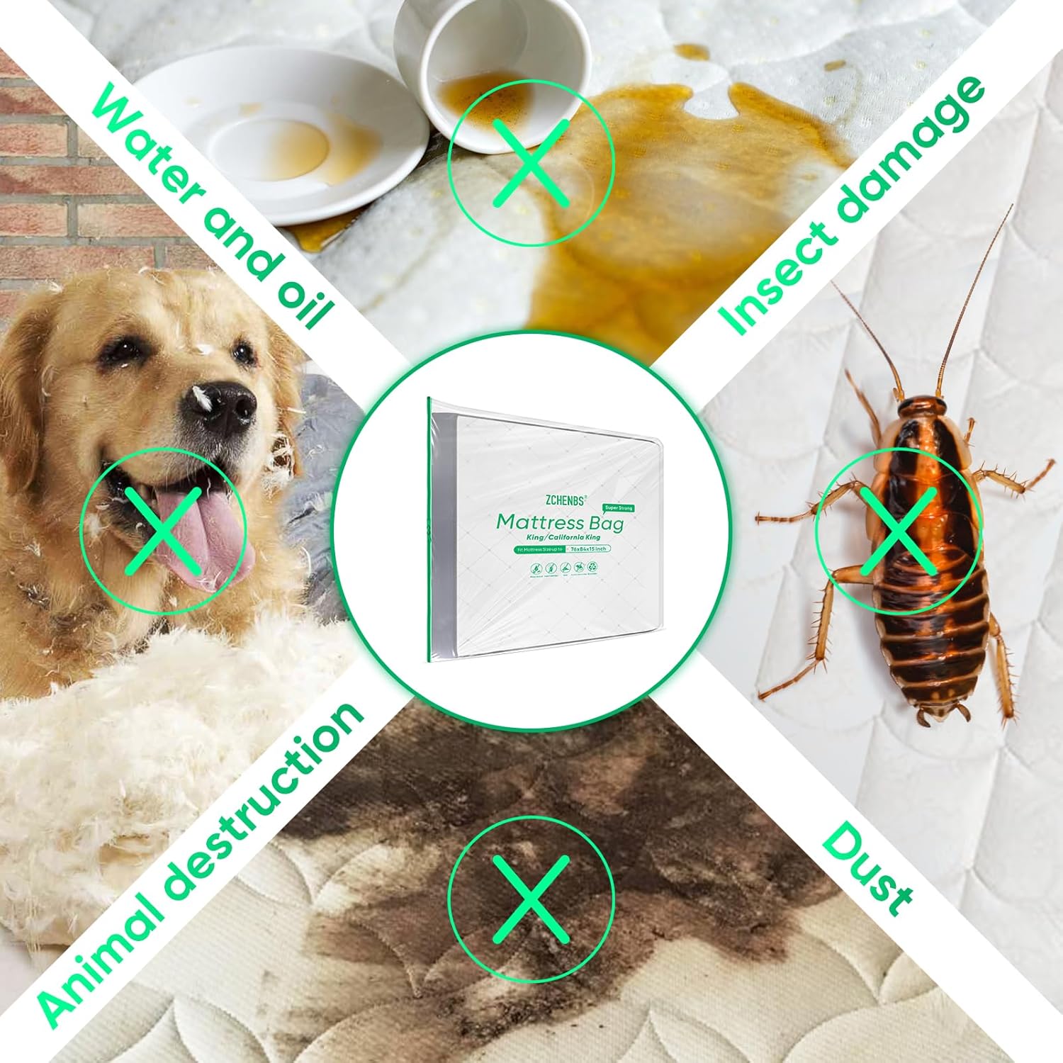 ZCHENBS® – Mattress Bags for Moving and Storage,Mattress Bag with Zippers,5 Mil Ultra-Thick Bed Bag,Waterproof,Anti-Tear,Heavy-Duty Mattress bag (Tansparent/Green, King/California King-(2 Pack))