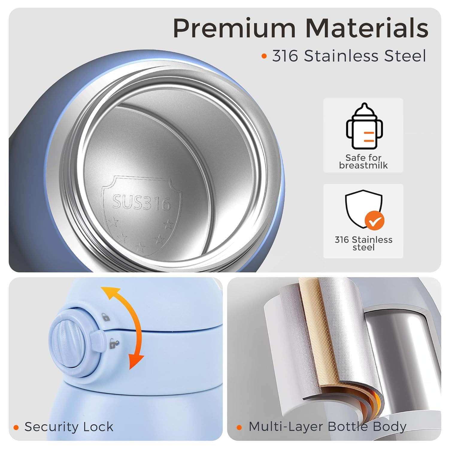 - Safe Materials & Mom-Friendly Design: Crafted from food-grade silicone accessories and 316 stainless steel. The secure safety lock and leak-proof plug prevent spills, ensuring peace of mind during travel. The inner wall of the bottle features clear measurement markings, making it easy to pour and track the amount of milk added. This portable baby bottle warmer includes a sponge brush to make cleaning effortless, helping you keep the bottle clean with ease