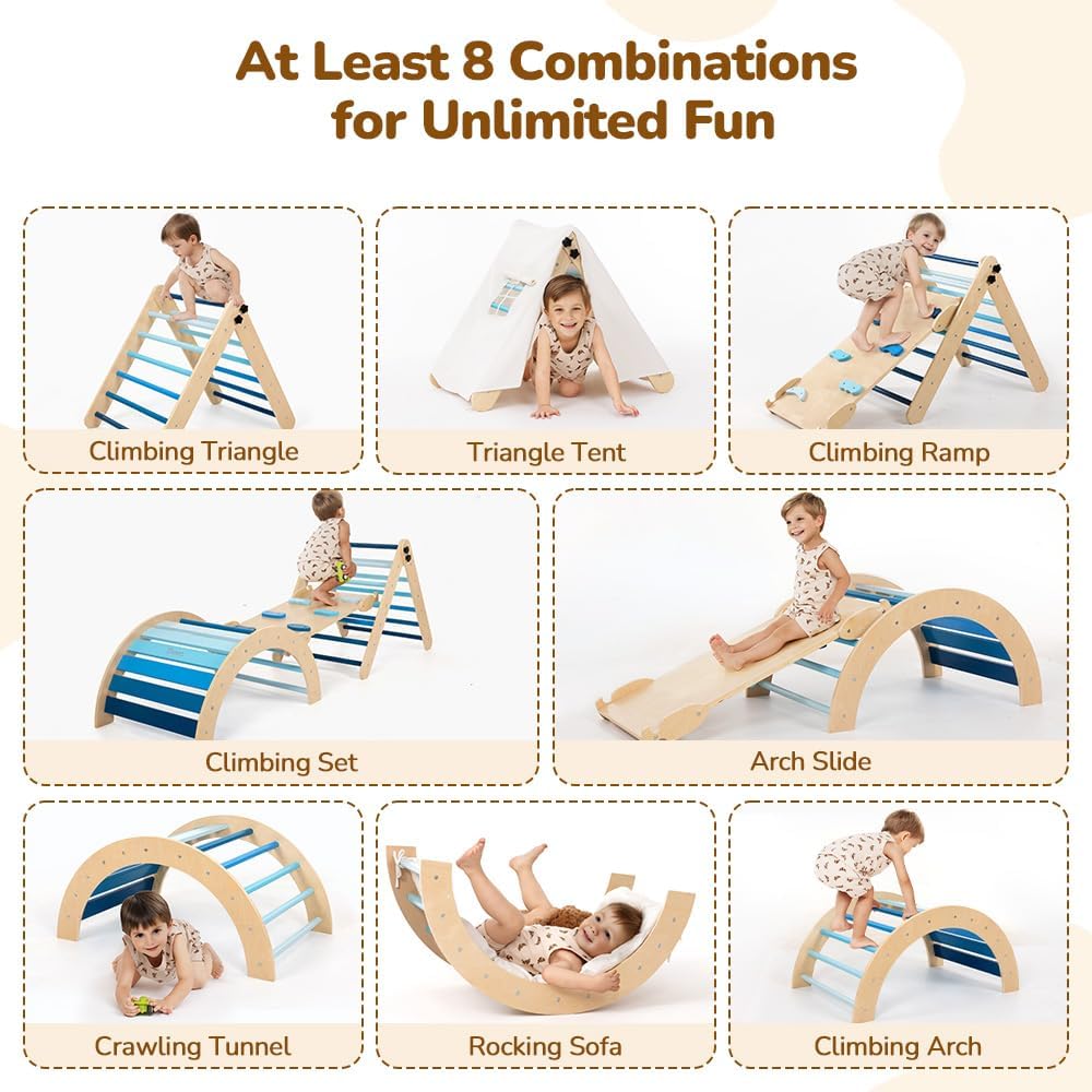 Pikler Triangle Set with Cushion, 8-in-1 Toddler Climbing Toys Indoor, Wooden Montessori Climbing Set with Arch Ramp,Ladder&Tent Cloth, Baby Indoor Climber Jungle Gyms for Toddlers Toy, Blue