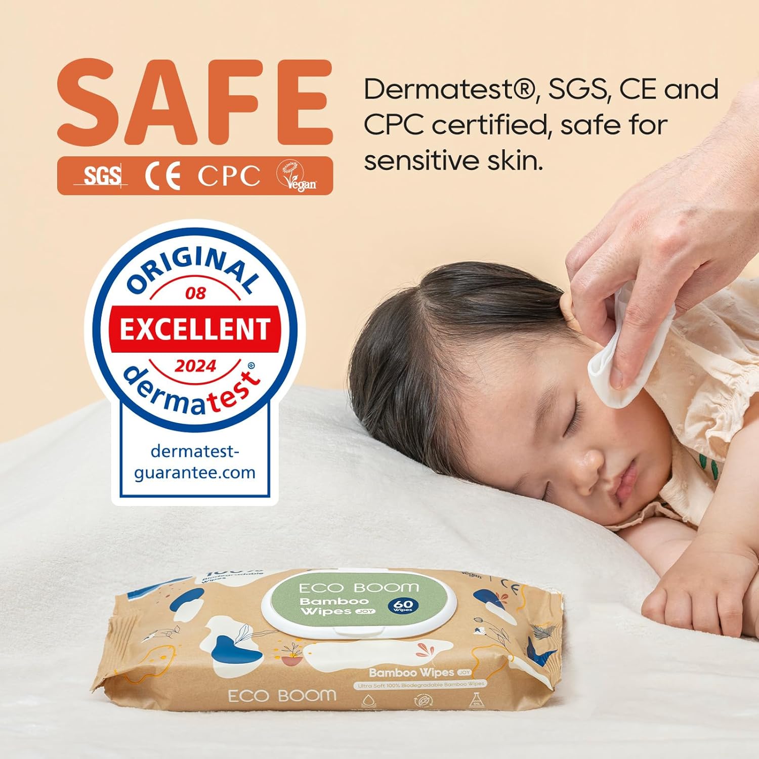 ECO BOOM bamboo Baby Wipes | natural | 100% Plant-Based & fragrance free | Unscented & safe for Sensitive Skin | 99% Water | 16 Pack, Bulk Total of 960