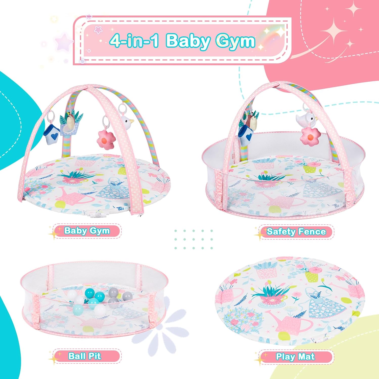 • 4 in 1 Infant Activity Center: Otrolepota baby play mat has 4 different uses;tummy time mat, baby gym, safety fence,ball pit with 10 balls included and cloud storage bag.