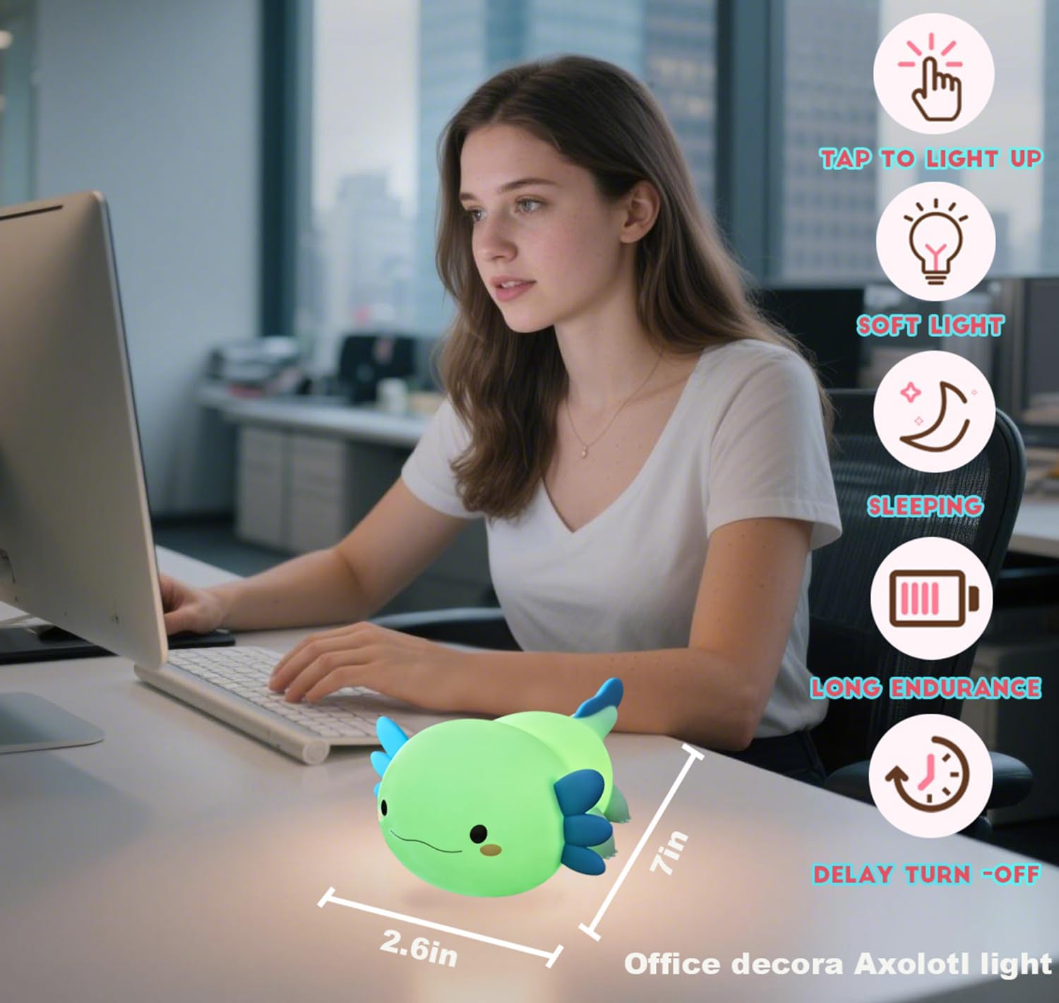 - Unique Cute Axolotl Night Light:Soft Silicone Animal Nursery Night Lamp!axolotl light dual brightness adjustment,USB charging,Soft lighting, not harmful to the eyes!axolotl lamp So Cool Stuff,Can Be Used As A Bedside Night Light For Kids And Adults,it helps make bedtime more fun and comforting.and also fantastic addition to your and kids nighttime routine! axolotl lamp kawaii design Can be used as Cute Room Decor Night Light,for Bedroom,Living Room,Dining,Desk Decorations.
