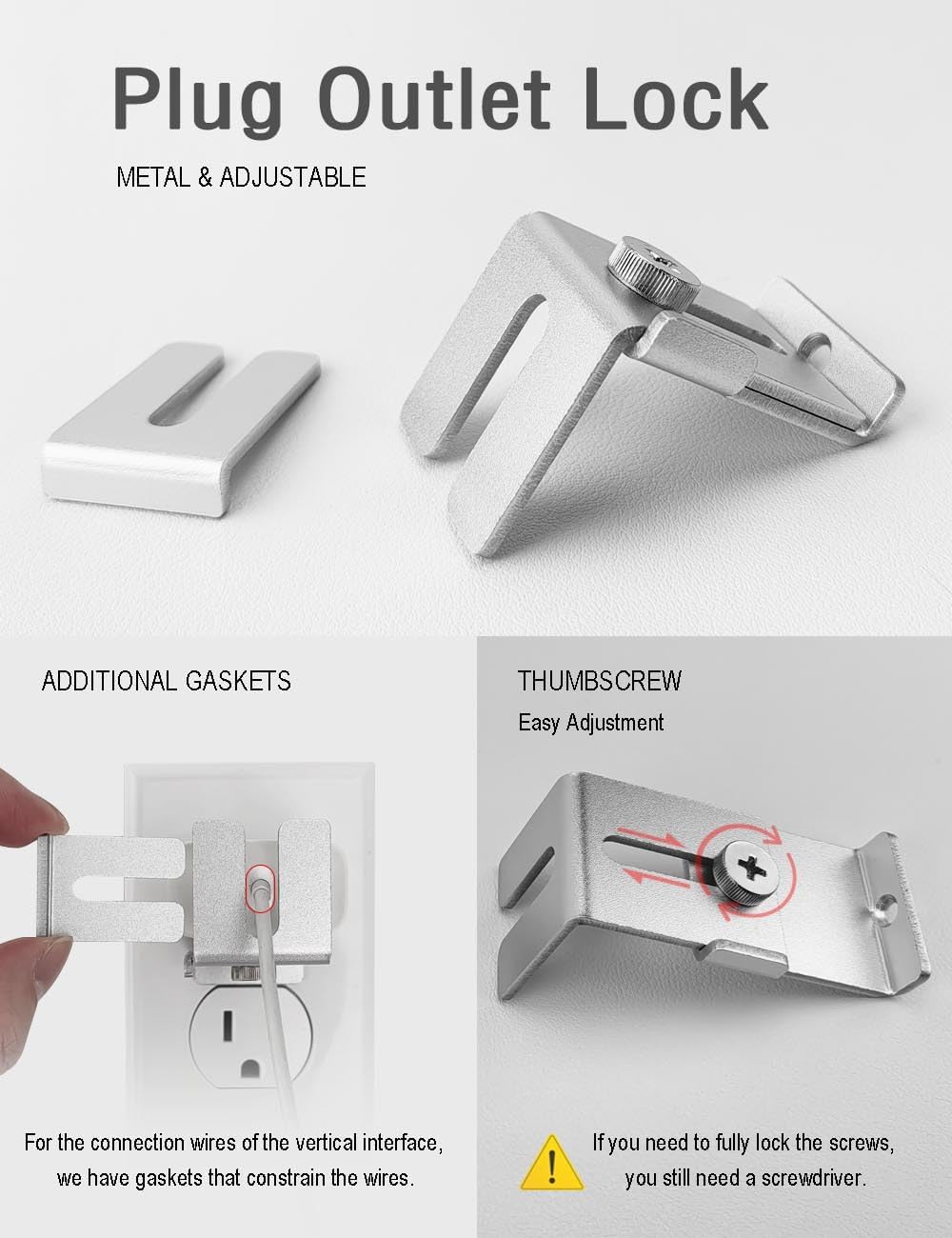 Charger Lock to Outlet, ILIVABLE Adjustable Metal Outlet Lock, Firmly Secures Power Plug from Unplugging (Silver, 1 Pack)