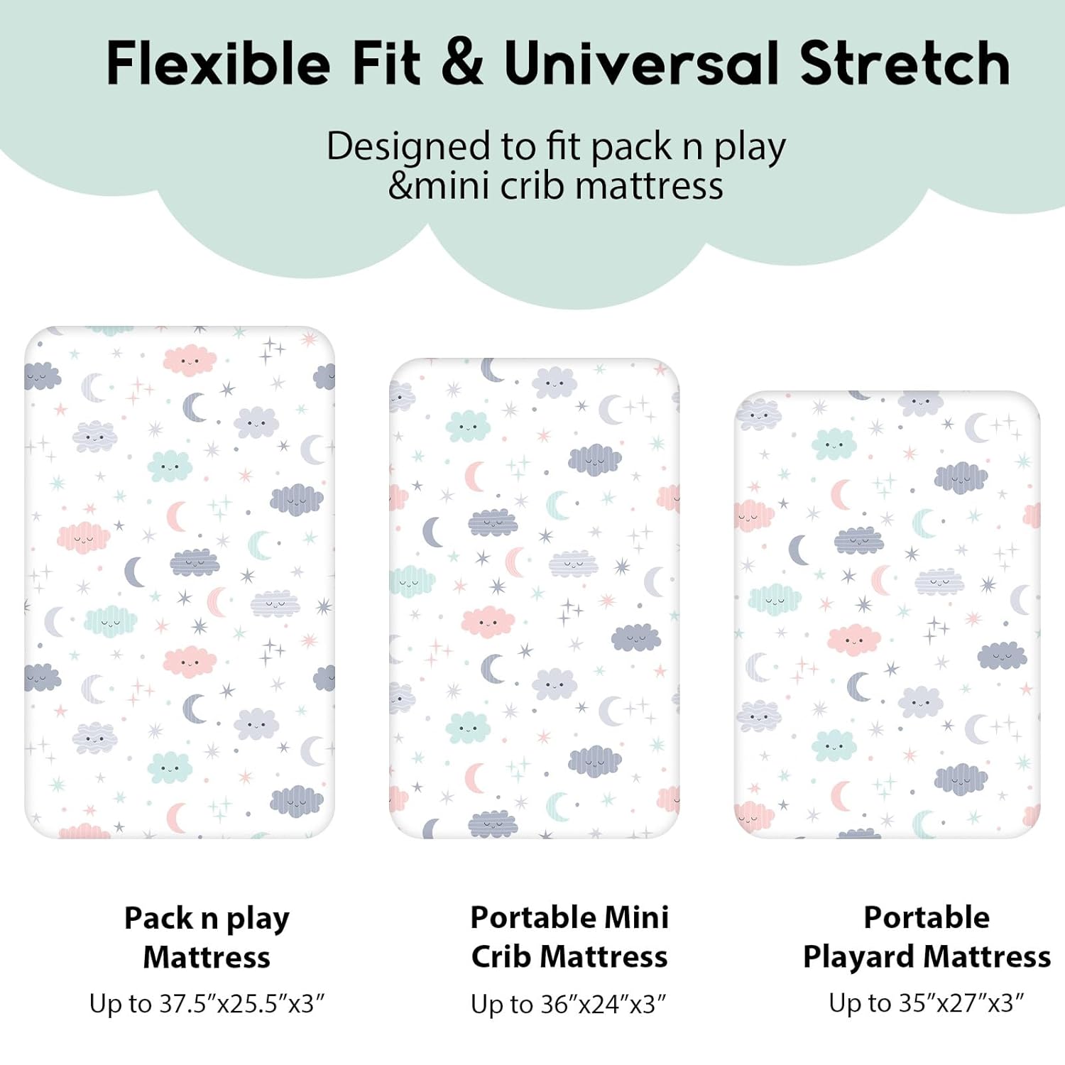 - EASY CARE: These mini crib sheets are machine washable and will remain shape after wash, moms won't have to worry about shrinkage, fading, or pilling. Each package contains 2 x pack and play sheets, you will always got one on hand.