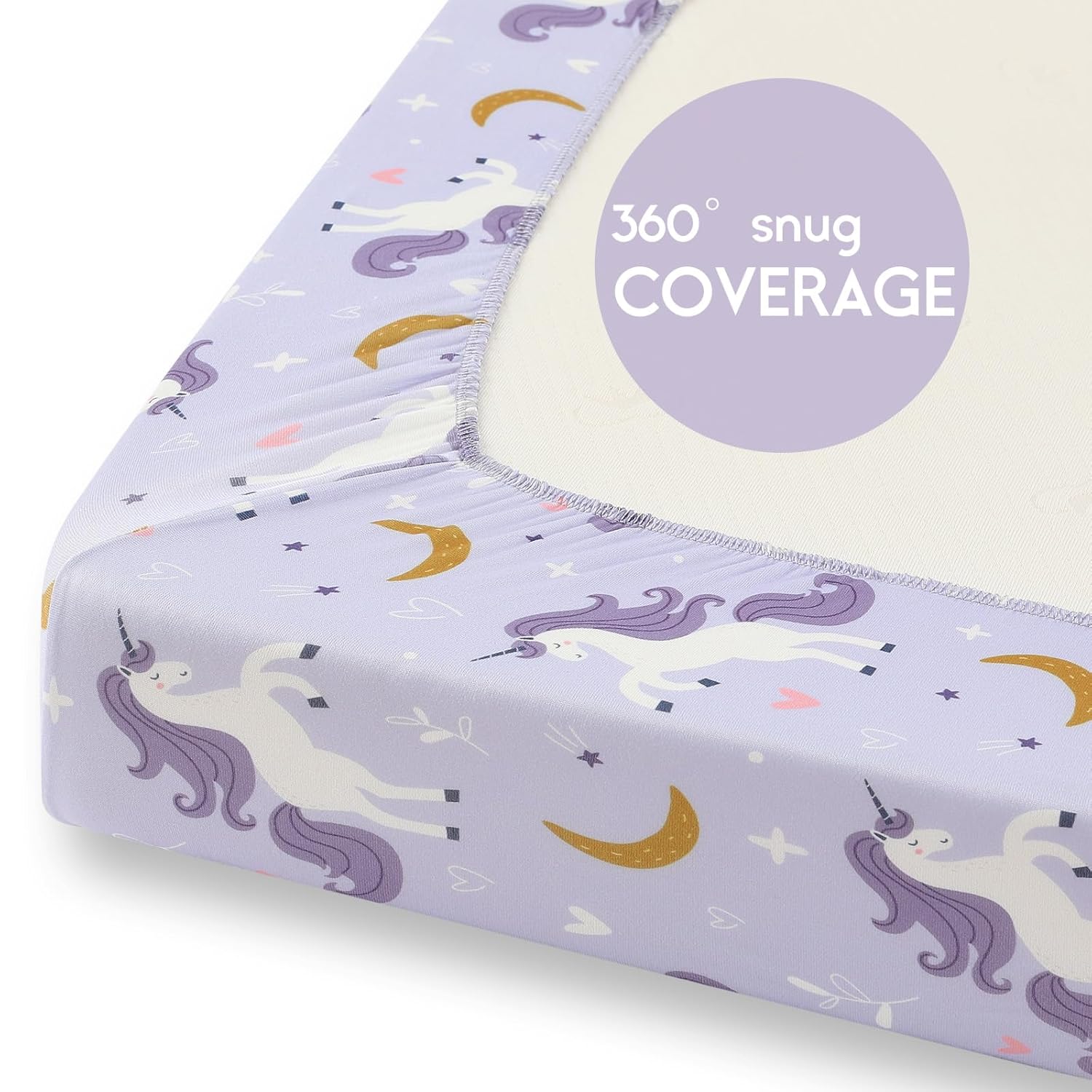 Yoofoss Pack and Play Sheets Fitted, Mini Crib Sheets 2-Pack for Pack N Play Mattress, Stretchy Playard Sheet, Soft and Breathable (Purple+Unicorn)