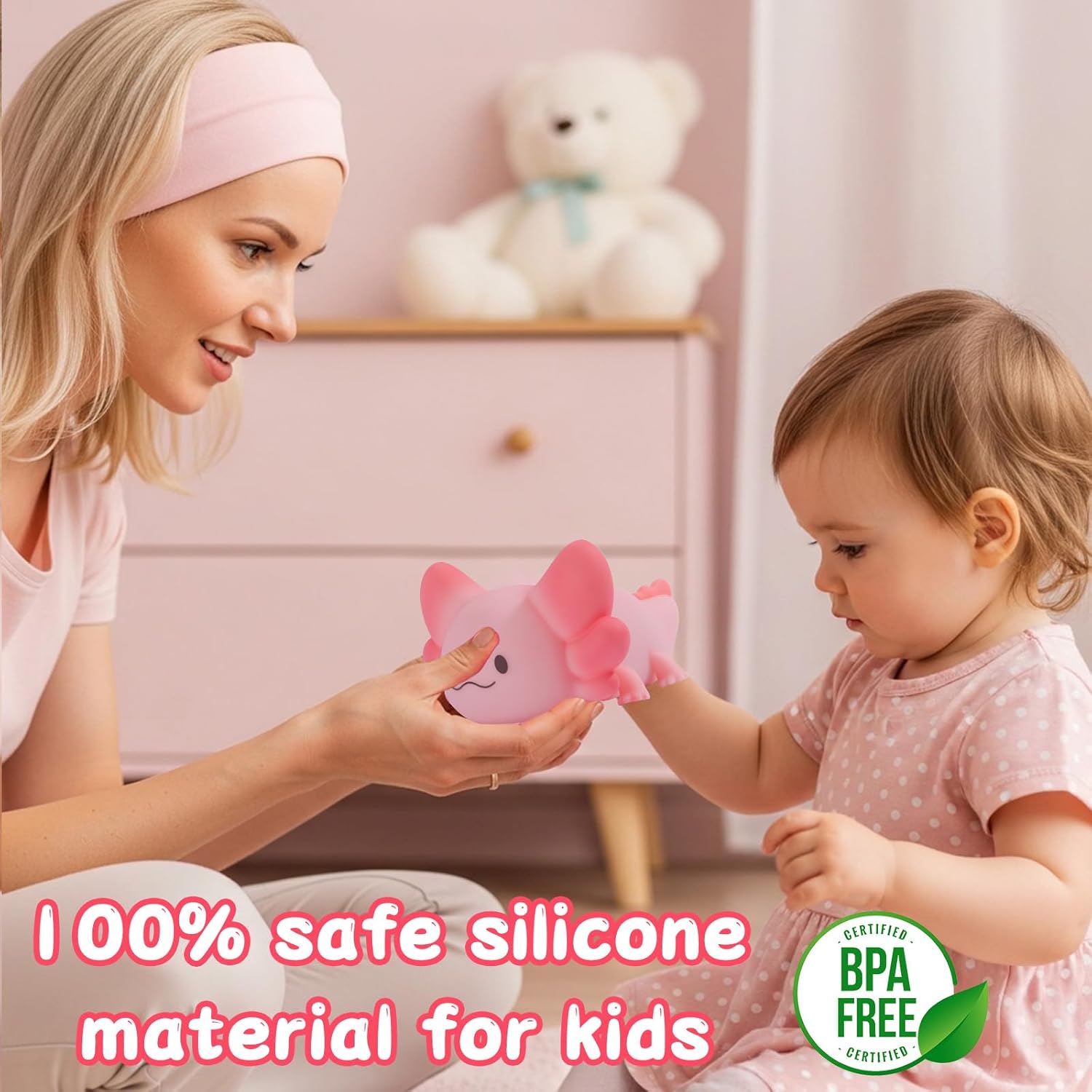 - 【 Safe Materials 】 The Axolotl night light is made of non-toxic baby safety silicone and does not contain bisphenol A. The soft silicone can be freely kneaded and quickly rebounded. The silicone shell is thickened to prevent easy breakage or damage. It can immediately relieve your stress. This is a baby night light and a stress relieving toy.
