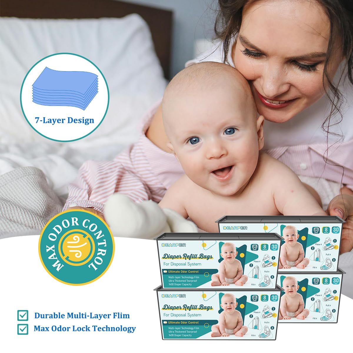 - POWERFUL ODOR ELIMINATION: Our Diaper Pail Refill is made of extra thick & durable 7-layer film with odor-locking Technology, effortlessly blocking out bad odors for a consistently fresh use, never worry about leaks and tears