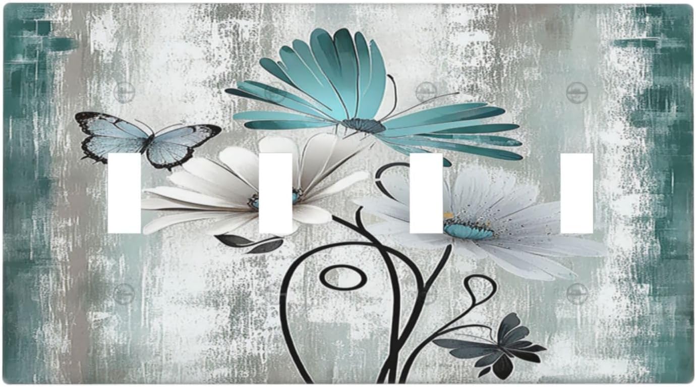 Light Switch Covers Rustic Teal Daisy Floral Flowers Butterfly Wood Grain Quad Toggle Electrical Faceplate 4 Gang Wall Plate Decorative Switch Plates for Bathroom Bedroom Decor