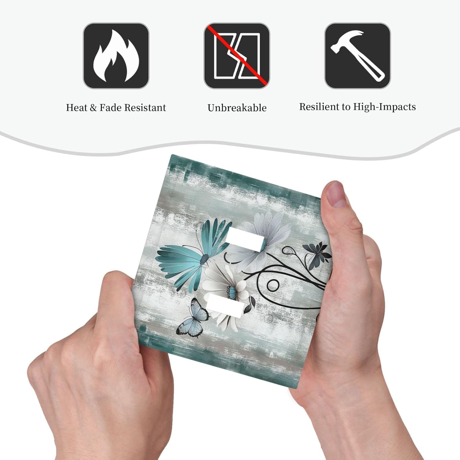 Decorative Switch Plates Rustic Teal Daisy Floral Flowers Butterfly Wood Grain 2 Gang Double Toggle Outlet Light Switch Cover Wall Plate Electrical Faceplate for Bathroom Bedroom Decor