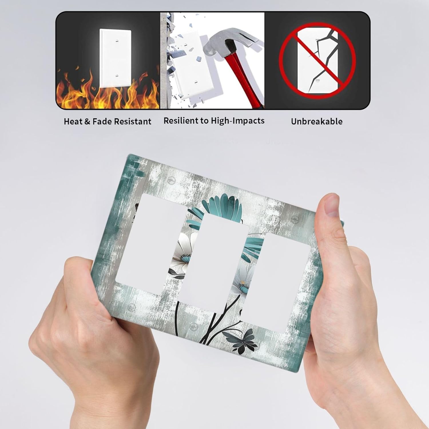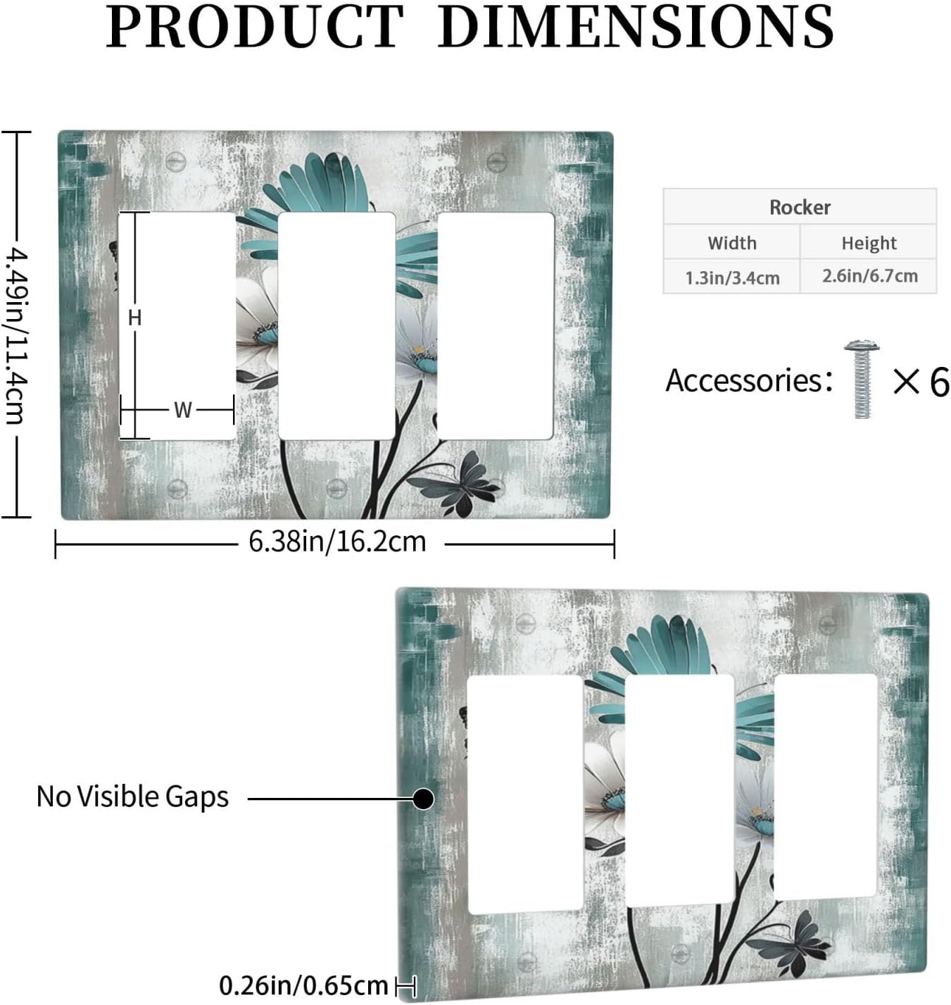 Light Switch Covers Rustic Teal Daisy Floral Flowers Butterfly Wood Grain 3 Gang Rocker Electrical GFCI Decorative Triple Outlet Wall Plate Cover Switchplate for Bathroom Bedroom Decor