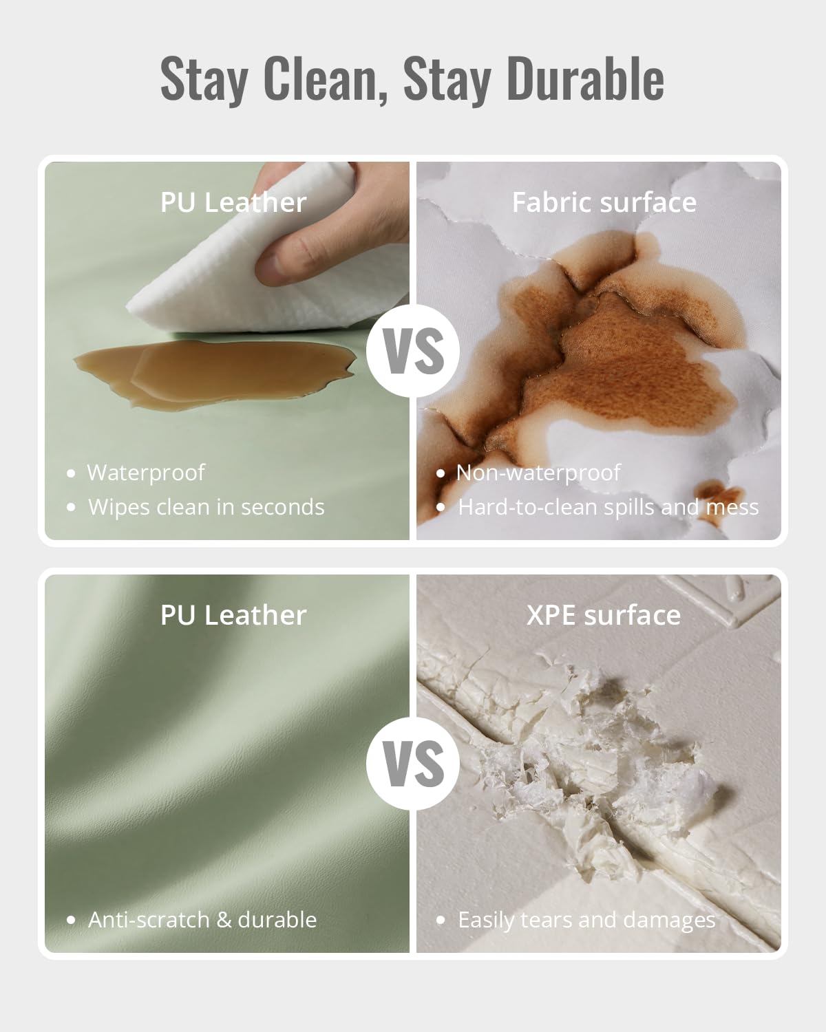 - Durable Vegan Leather for Long-Lasting Use-Our baby play mat surface is crafted from high-quality vegan leather, offering superior durability compared to traditional XPE mats. The premium surface is designed to resist wear and tear from everyday use, maintaining its stylish appearance. This mat provides a reliable play area that stands the test of time