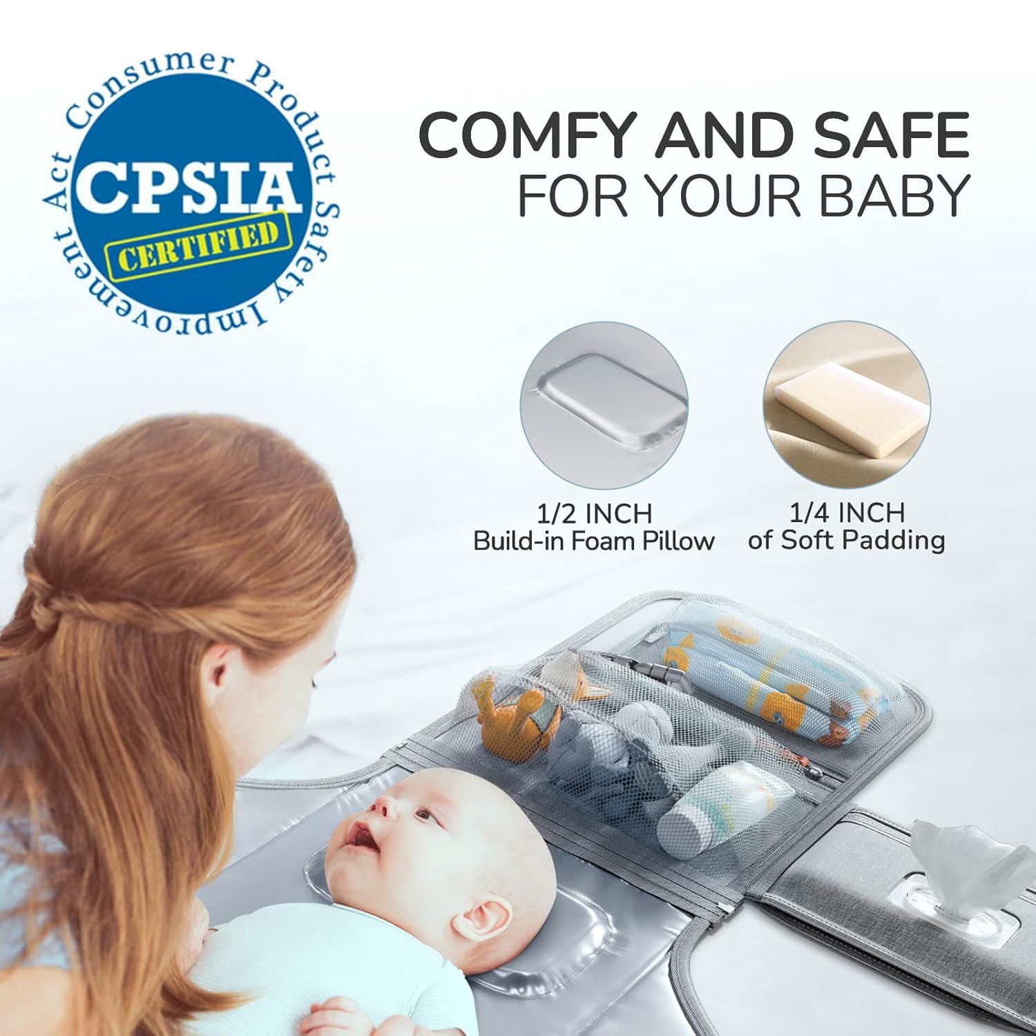 - EASY TO CLEAN AND COMFY FOR BABY. The Alatino Portable Changing Pad is made of premium materials The high-quality padded surface features a built-in ½ inch memory foam pillow to cushion your baby’s head. Also, the waterproof material surface makes it easy to clean with a quick wipe down when messes happen.