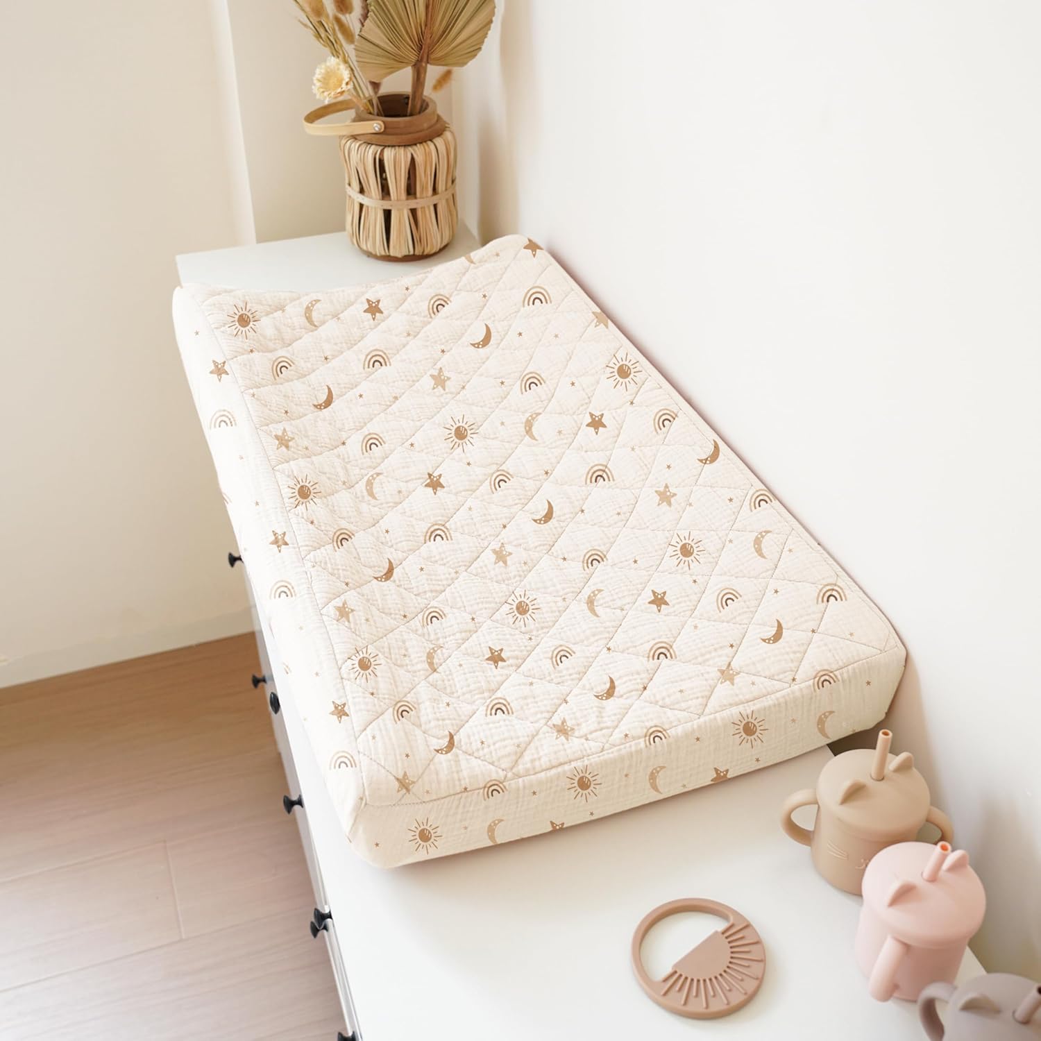 - Quilted and Soft Fabric: Our changing pad cover consists of three layers: the top layer is made of 100% cotton (muslin), which is soft and absorbent; the middle layer is quilted with soft padding to ensure coziness and comfort; and the bottom layer is made of 100% waterproof polyester to protect the pad from wetting. Our unique design provides a comfortable touch for your baby while ensuring waterproof functionality, making our changing pad soft and perfect for delicate baby skin.