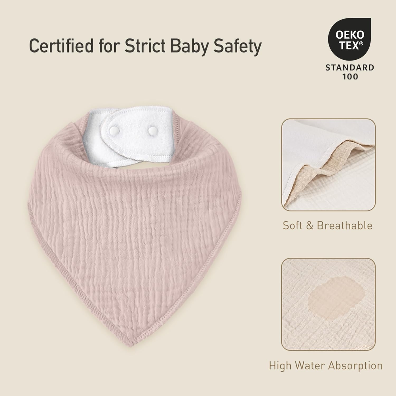 - Soft & Absorbent: Our baby drool bibs are OEKO-TEX STANDARD 100 certified. Fronts of 100% muslin cotton and polyester backs offer max absorption with skin-friendly softness. Soft, breathable design soaks up drool/spit-up, keeping babies clean & dry all day.