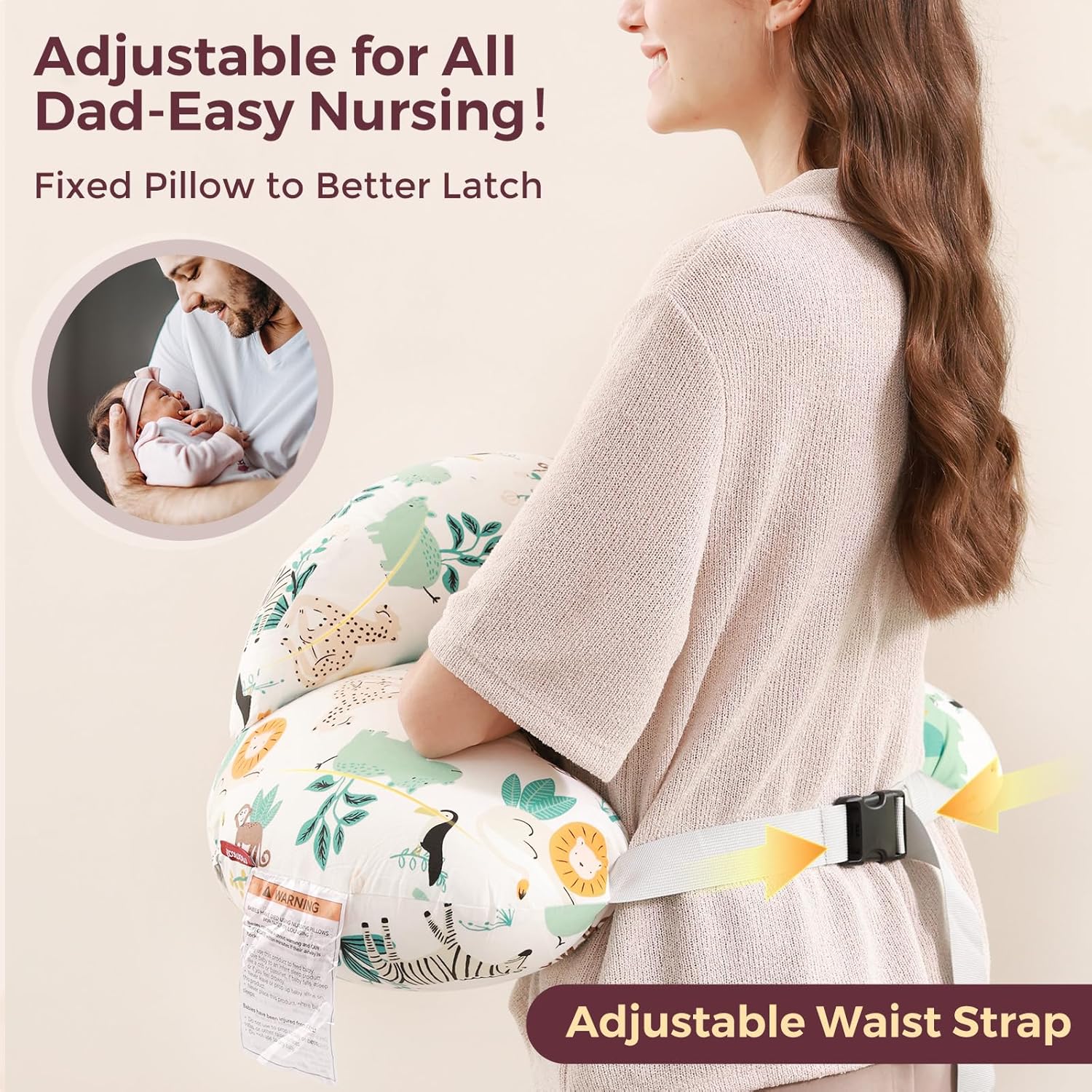 - Widen Design for All Around Support and Adjustable for Most Bodies: Through the feedback of many customers, we have widened the sides of nursing pillow to provide more comprehensive arms support for moms. Size: 28.3''(L)*18.1''(W)*7.9''(H). The perfect mix of soft and firm. With an adjustable waist strap, it fits most sizes and helps this pillow hug your body securely while staying in the ideal position, eliminating the gap between you & baby