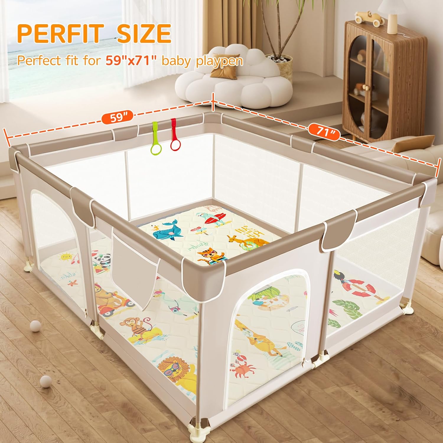 - Versatile Large Play Area - With generous 71"x59" dimensions, this spacious activity mat perfectly accommodates standard playards while serving multiple functions as a nursery floor mat, toddler play space, kids' teepee tents padded mat, or cozy surface for reading and playtime. The ideal size provides ample room for babies to move freely during crucial developmental stages.