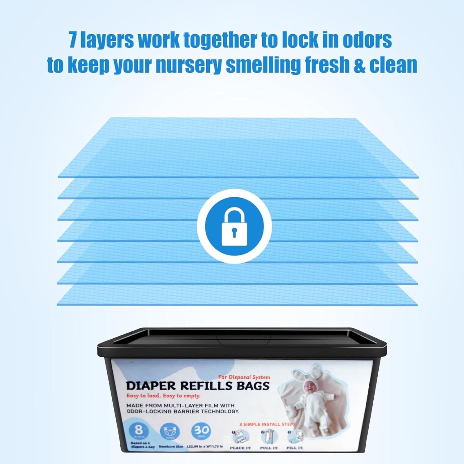 - ODOR CONTROL: Our Diaper Pail Refills Bags are more tear resistant than other available bags, uses a special PE layer with a 7-layer design to lock odor effectively. Both sides of the plastic are sealed to prevent odor leakage, Making the baby's room smell clearer and healthier